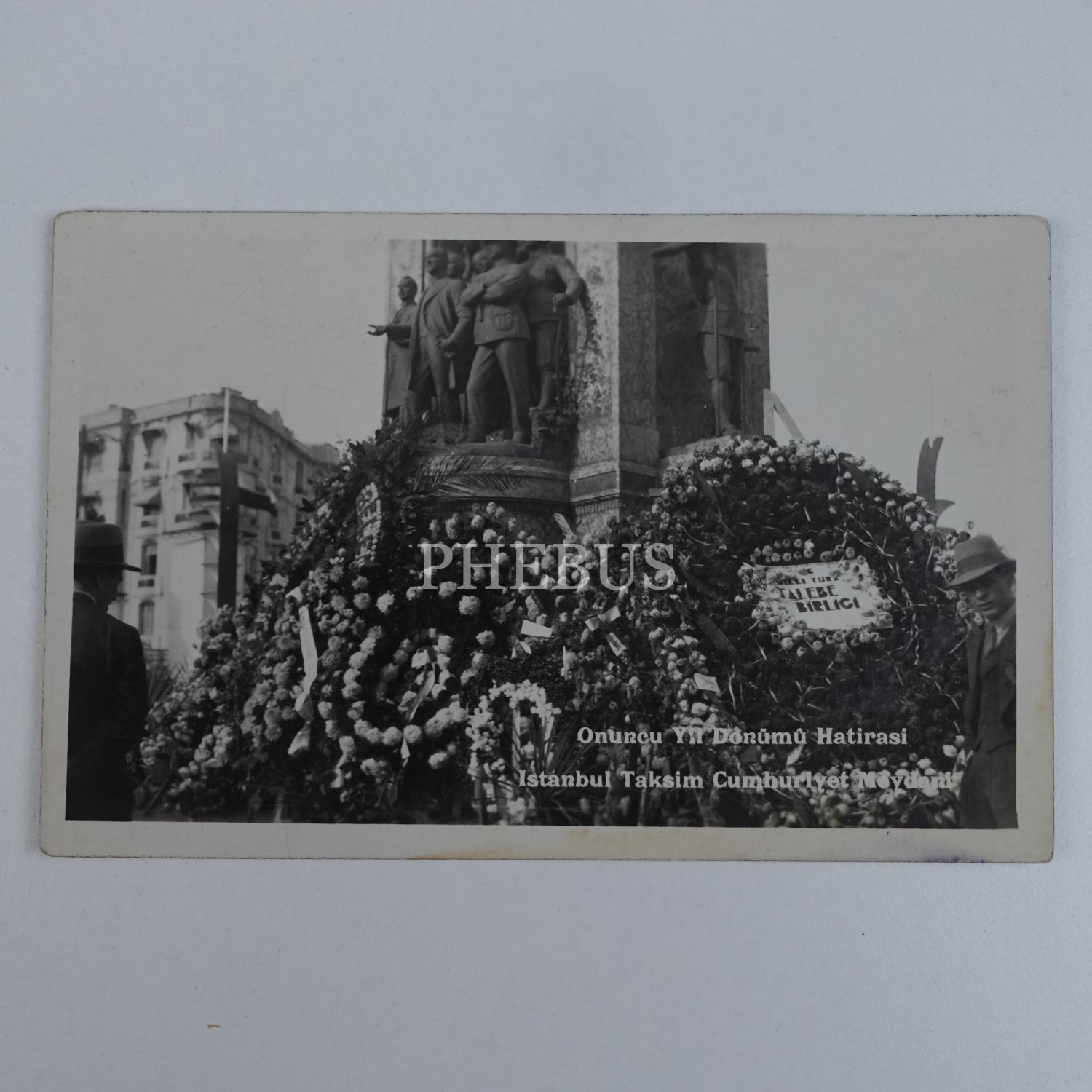 Taksim´de düzenlenen 10. Yıl törenlerinde çelenklerle donatılmış Cumhuriyet Anıtı, çelenklerden birinin üzerinde "Millî Türk Talebe Birliği" yazılıdır, 14x9 cm...