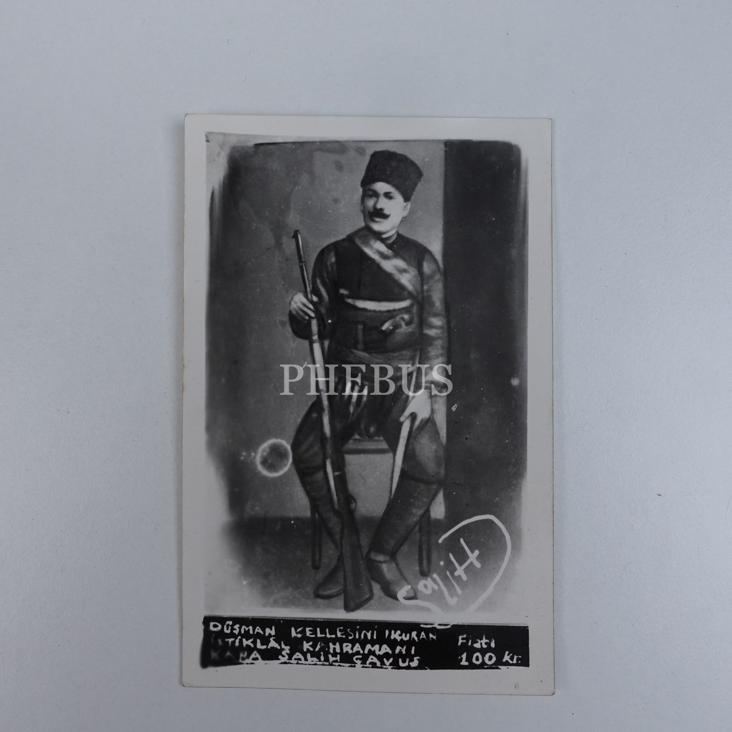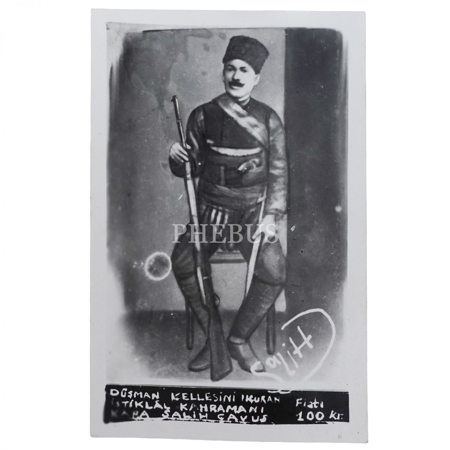 Balkan Harbi, Çanakkale Harbi ve Millî Mücadele´de büyük yararlıklar gösteren Kara Salih Çavuş´un, "Düşman Kellesini Uçuran İstiklâl Kahramanı Kara Salih Çavuş" başlıklı fotokartı, 9x14 cm...