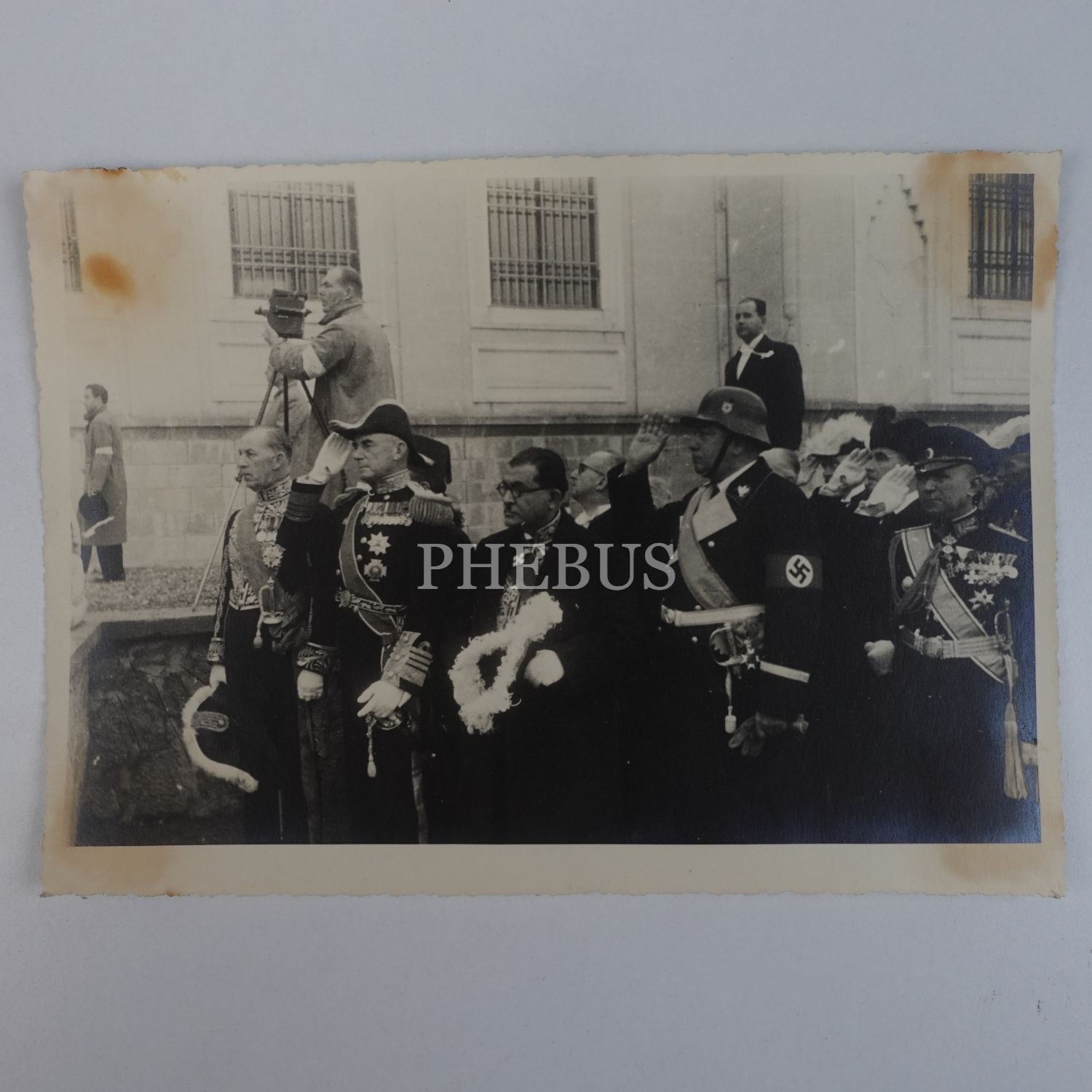 Adolf Hitler’in emriyle Nazi Almanyası´nı temsilen Mustafa Kemal Atatürk´ün cenazesine katılan Konstantin von Neurath, Nazi selamıyla Atatürk’ün naaşını selamlıyor... Aynı karede Akdeniz Filosu Başkomutanı Oramiral Dudley Pound da görülmektedir, arka yüzü "Foto S. Süreyya - Beyoğlu" damgalı, 23x16 cm...