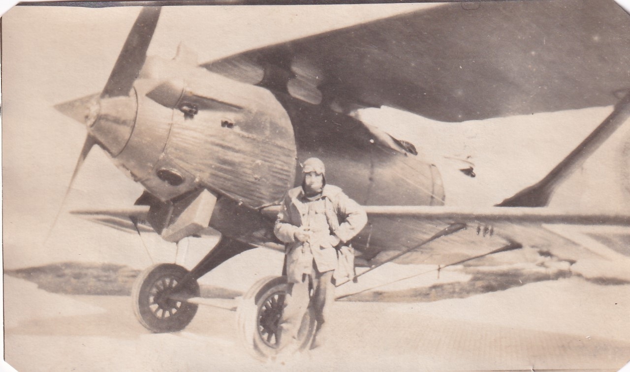İlk Kaptan Pilotlardan Efsane Tayyareci Mustafa (Deli) Tahir MANER Eskişehirde tayyare önünde, kenarları kopuk, 10x6 cm