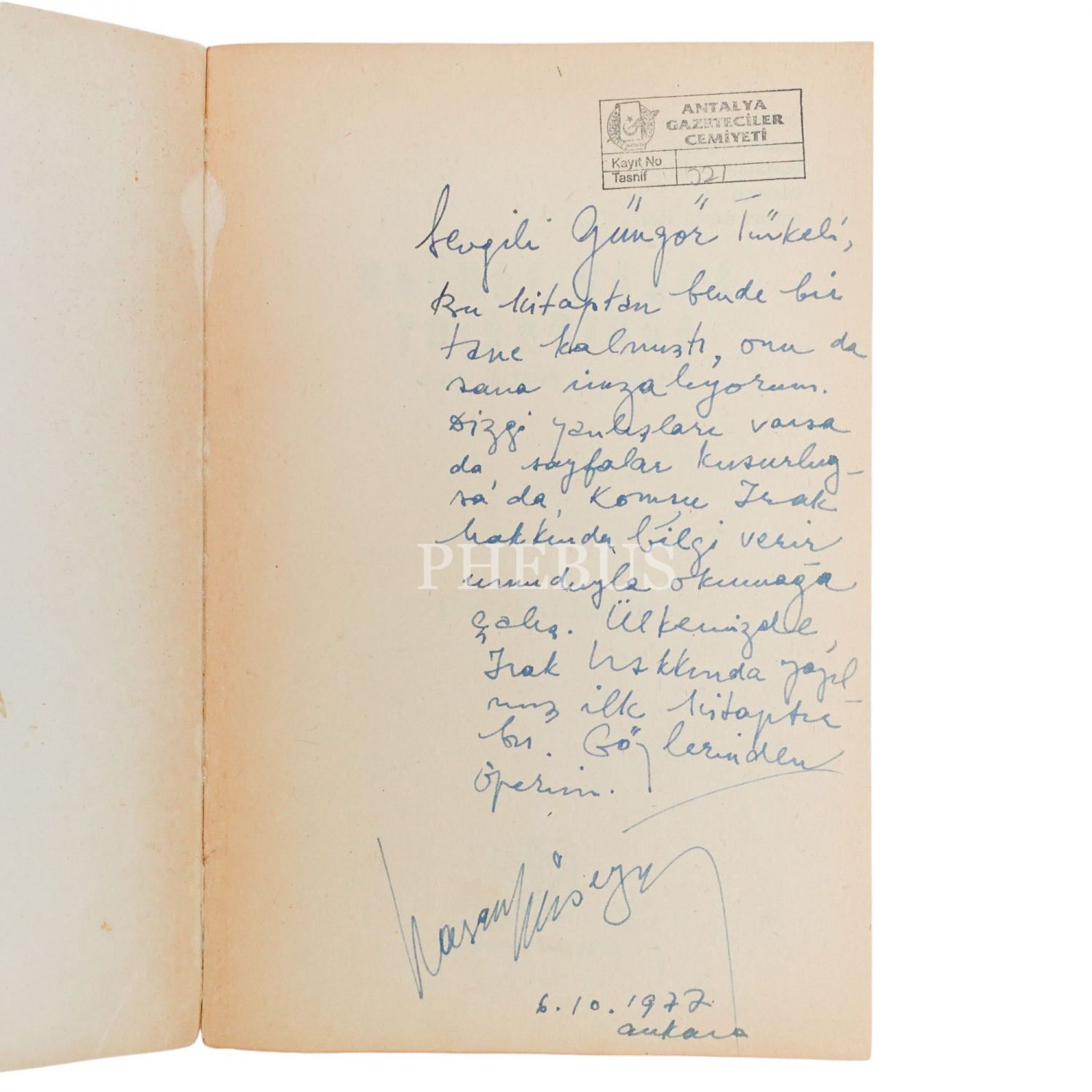 "Sevgili Güngör Türkeli, Bu kitaptan bende bir tane kalmıştı, onu da sana imzalıyorum. Dizgi yanlışları varsa da, sayfaları kusurluysa da, komşu Irak hakkında bilgi verir umuduyla okumağa çalış. Ülkemizde Irak hakkında yazılmış ilk kitaptır bu. Gözlerinden öperim." ithafıyla, 6 Ekim 1977 tarihinde imzalanmıştır.