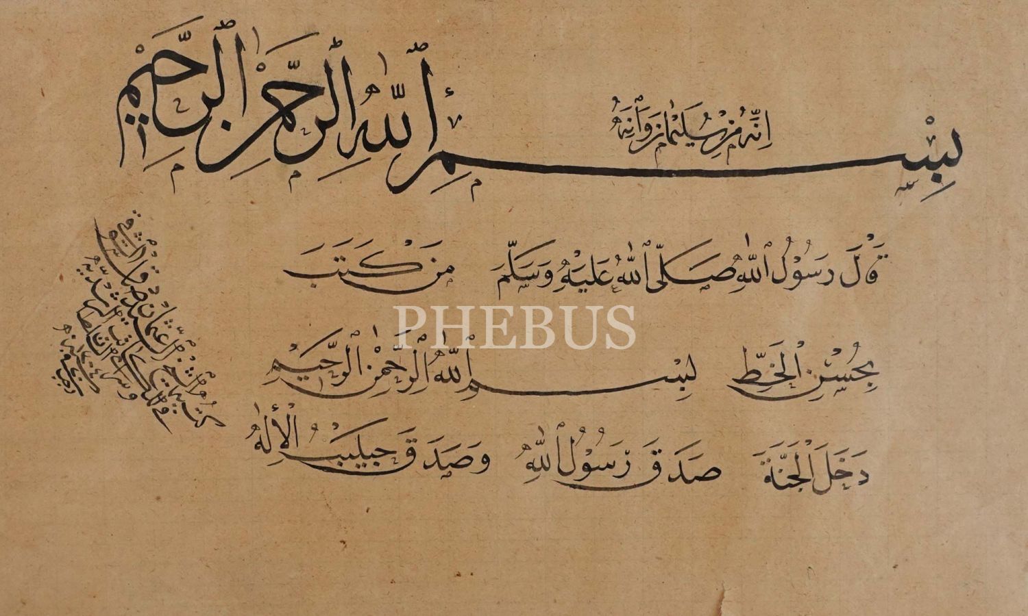Sülüs kısım: Oklu besmele. Nesih kısımdaki hadis-i şerif: "Kim güzel bir yazıyla besmeleyi yazarsa cennete girer"