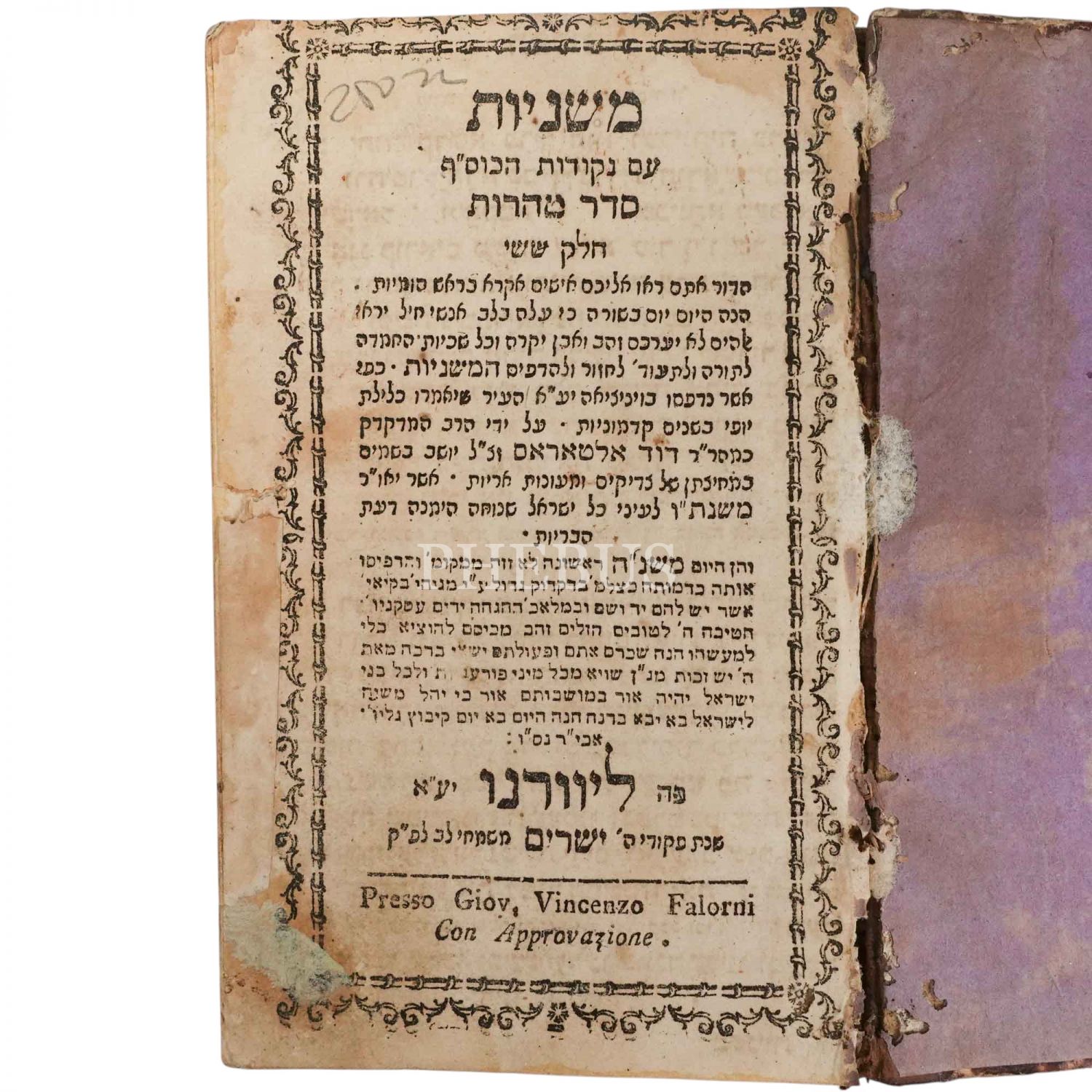 MİSHNAYOT, SEDER TEOROT (מִשְׁנָה). 6. bölüm, İtalya Livorno Baskısı, Vincenzo Falorni Onayı ile, 230 Sayfa, 22 x 14 cm...