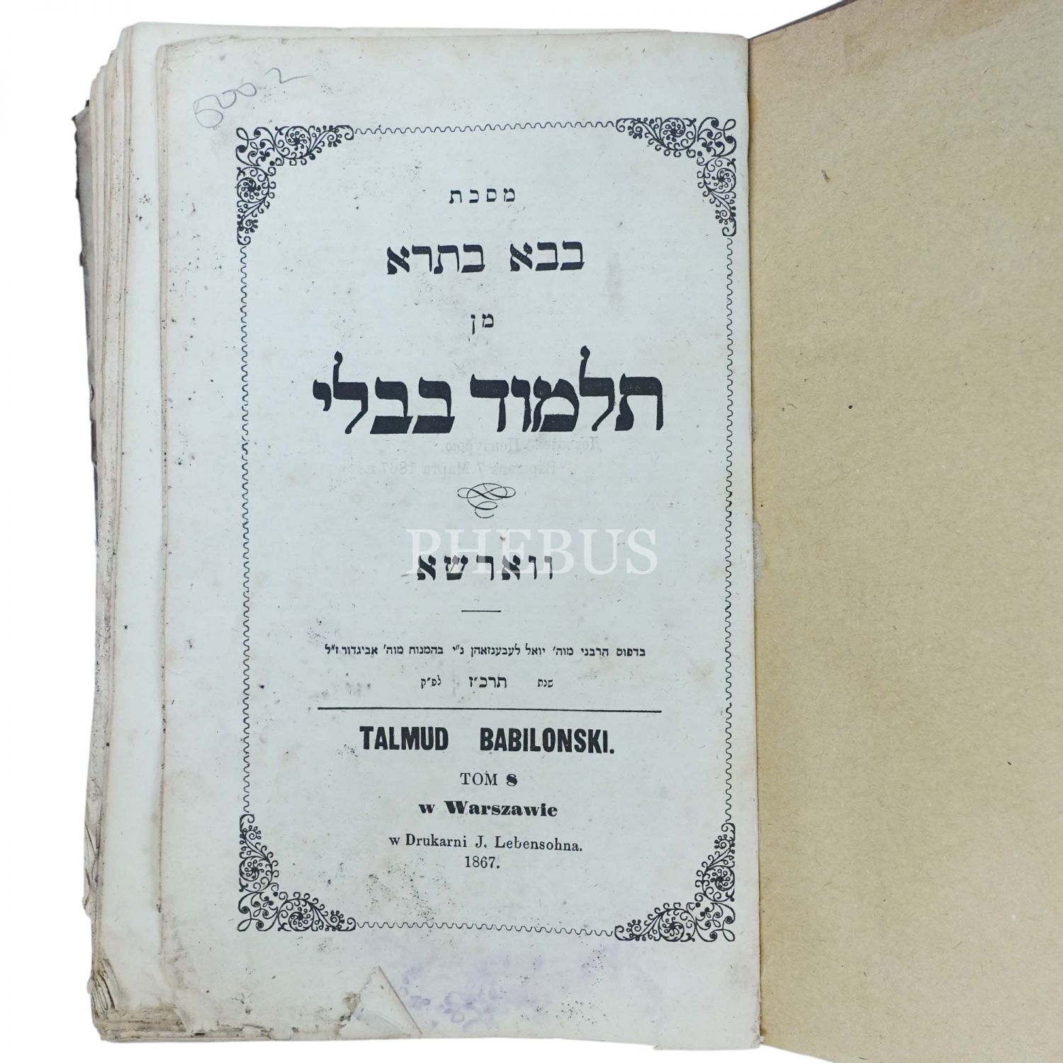 MASECHET BATRA TALMUD BAVLİ, Varşova 1867-5627, Cilt 8, Drukarni J. Lebensohna, 504 Sayfa, 23 x 15 cm...