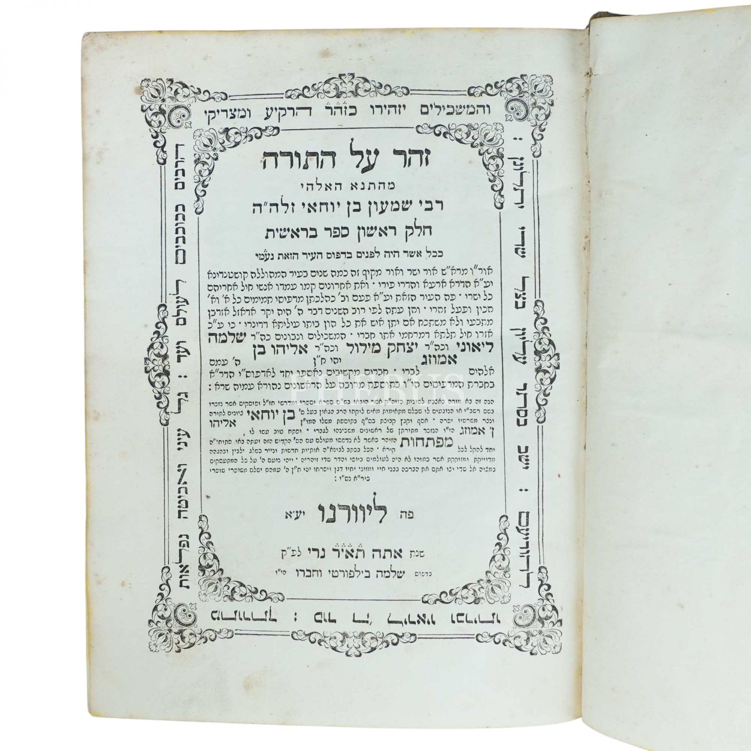 ZOHAR AL HATORAH (זֹהַר‎) , Tevrattan Başlangıç Kitabı ( בְּרֵאשִׁית‎ ) Konulu Yorumlar İçerir. İtalya Livorno Baskısı, 19 x 25 cm...
