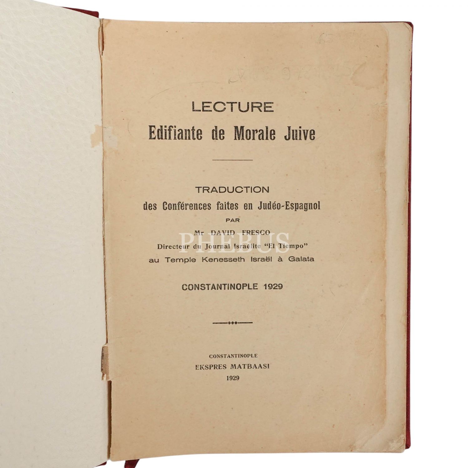 LECTURE EDIFIANTE DE MORALE JUIVE, David Fresco, Constantinople 1929 Ekspres Matbaası, 204 Sayfa, 19,5 x 13 cm...