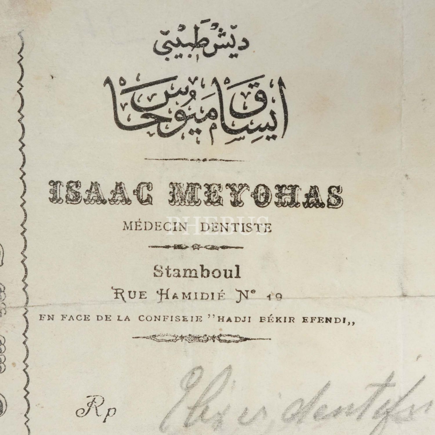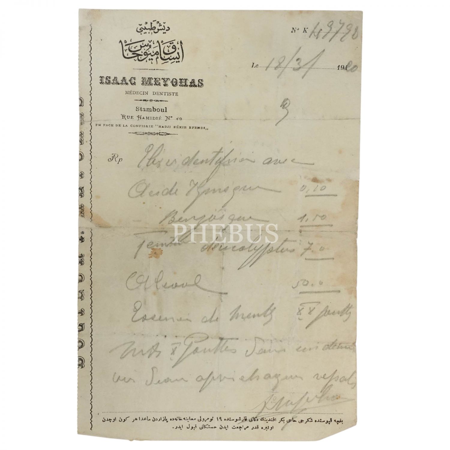 Tıp tarihi, İstanbul Hamidiye Sokağı´nda diş tabibi İsaac Meyohas 2 lisan antetli (Osmanlıca-Fransızca) reçete, 1920 tarihli, tamirli...