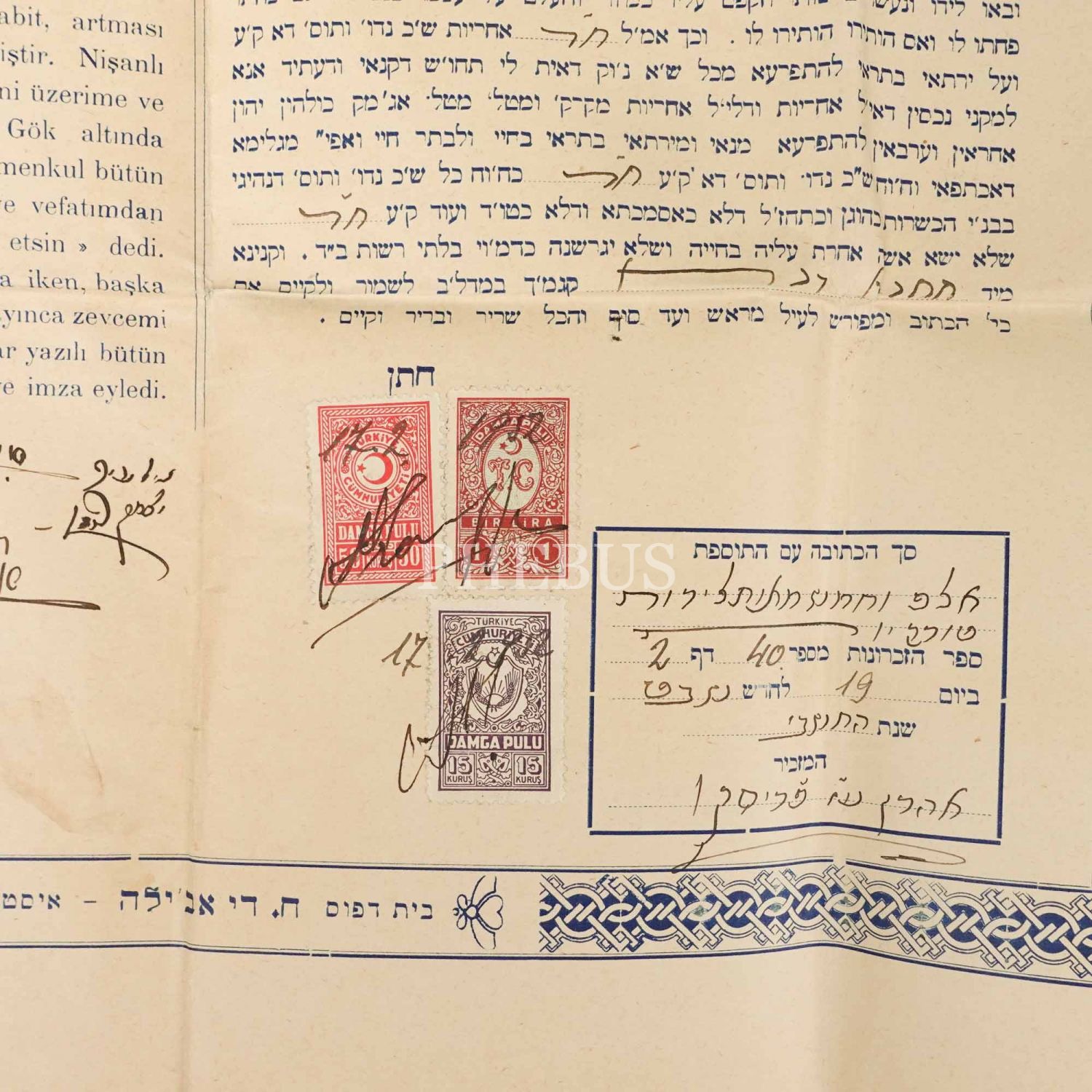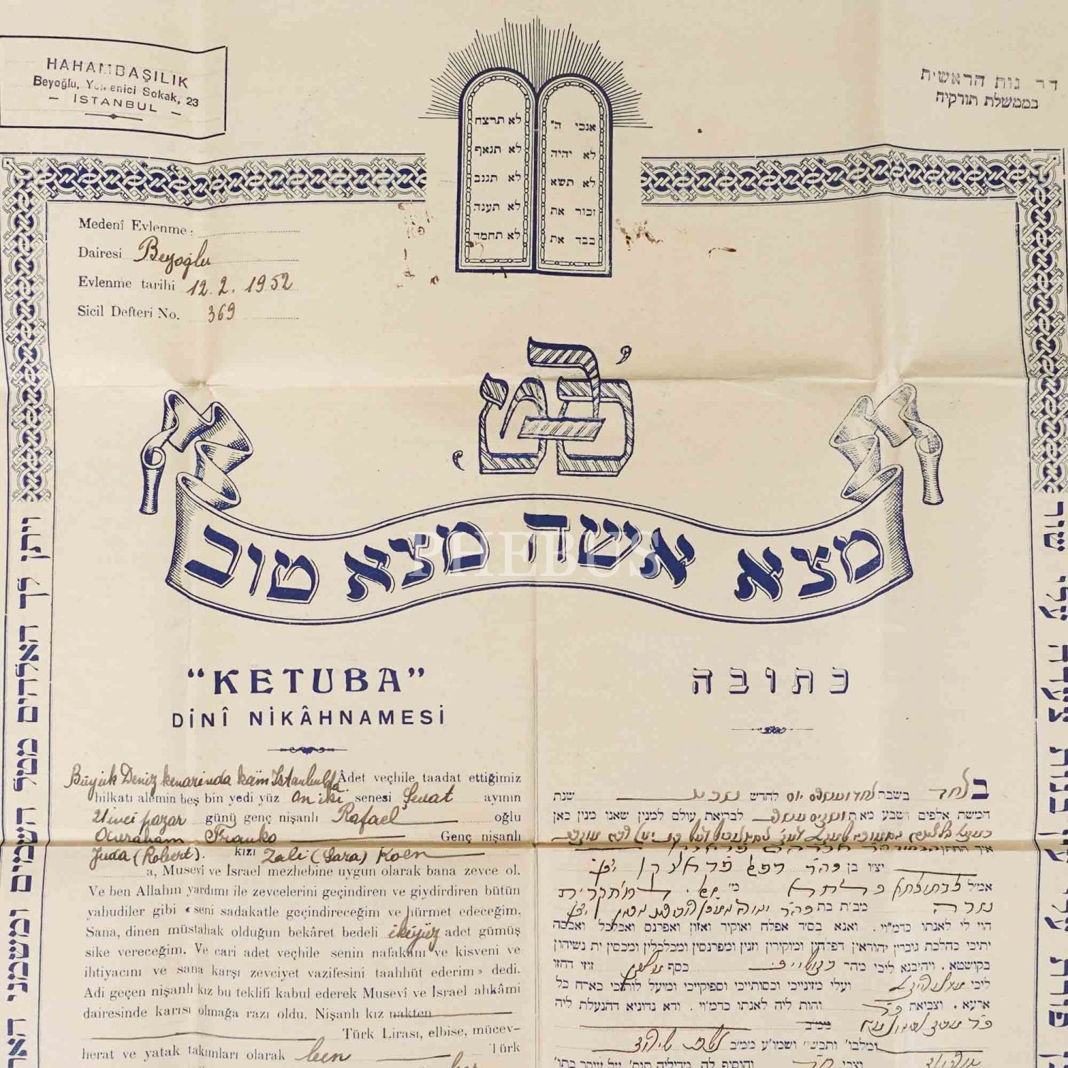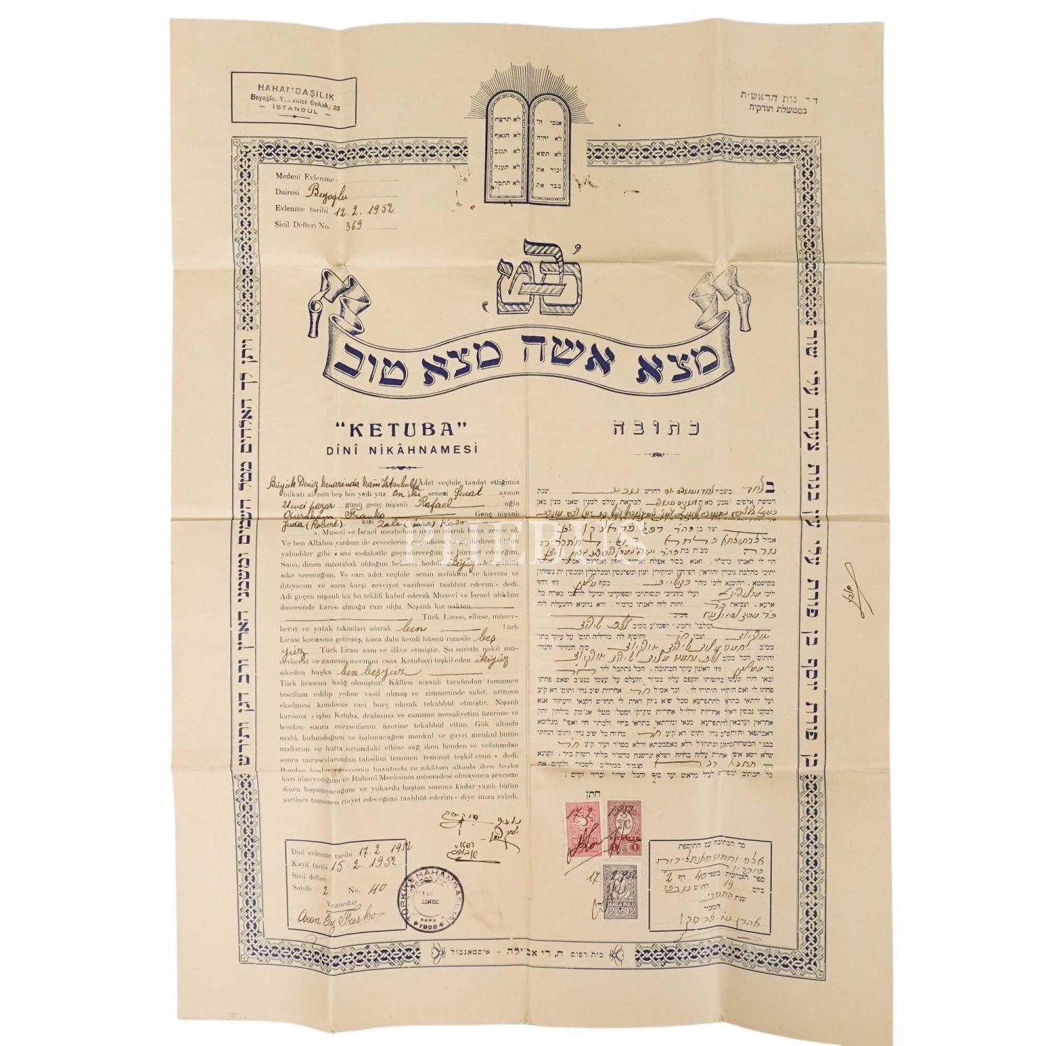 Yahudi Evlilik sözleşmesi, KETUBA, Türkiye Cumhuriyeti Hahambaşılığı Grand Rabbinath de Turquie Constantinople Kaşeli, 75 x 50 cm...
