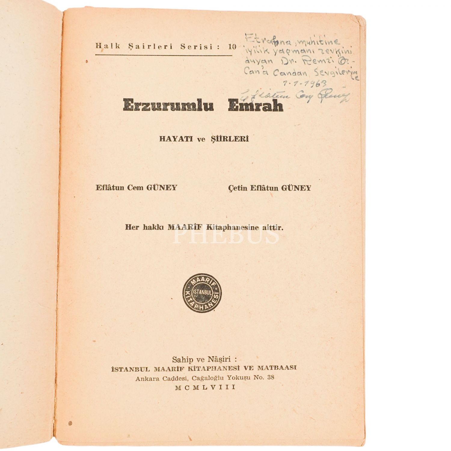 ERZURUMLU EMRAH HAYATI VE ŞİİRLERİ, Eflatun Cem Güney, Çetin Eflatun Güney, 1958, Maarif Kitaphanesi, 143 sayfa, 14x20 cm...