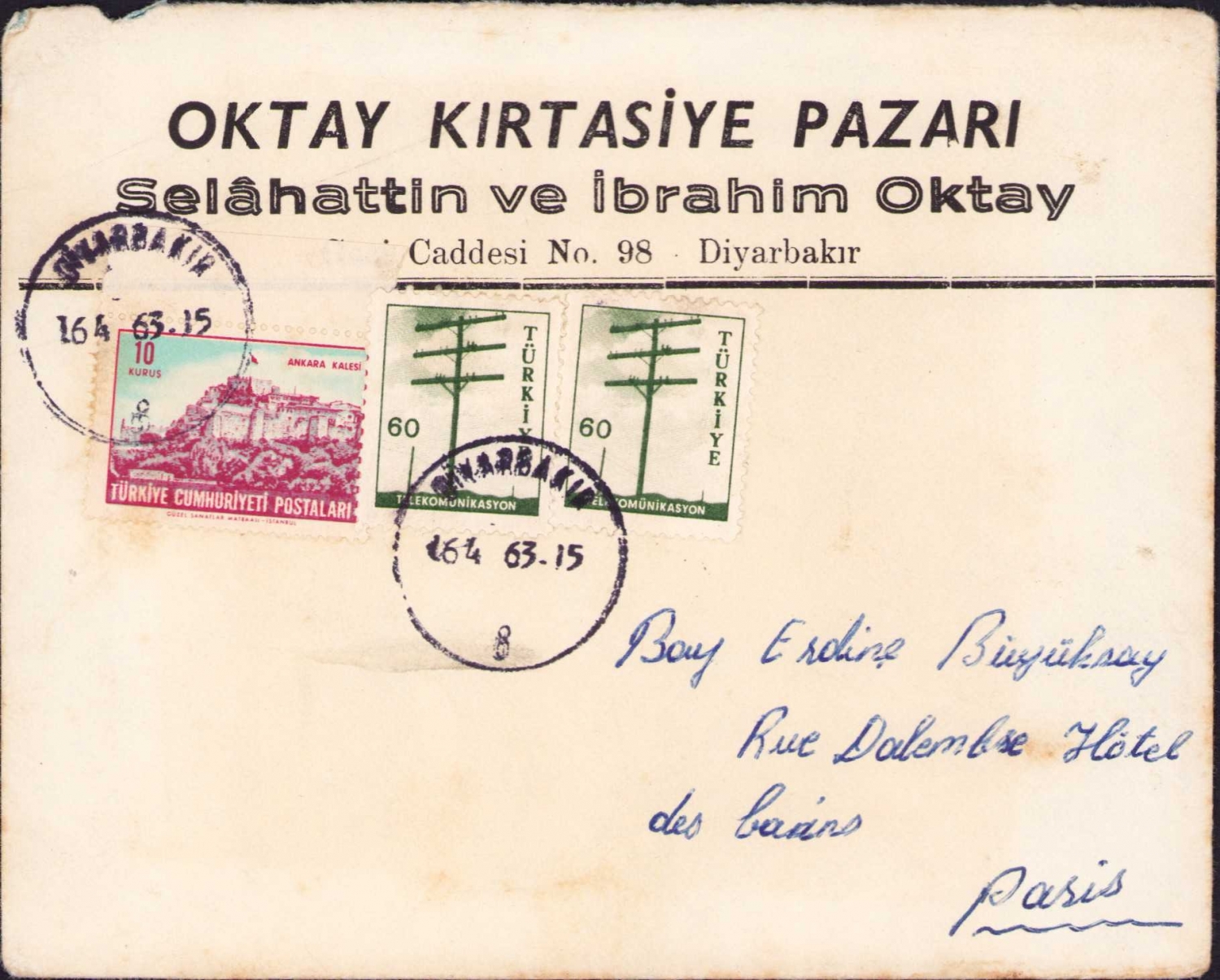 Diyarbakır Oktay Kırtasiye Pazarı Selahattin ve İbrahim Oktay antetli zarf, postadan geçmiş