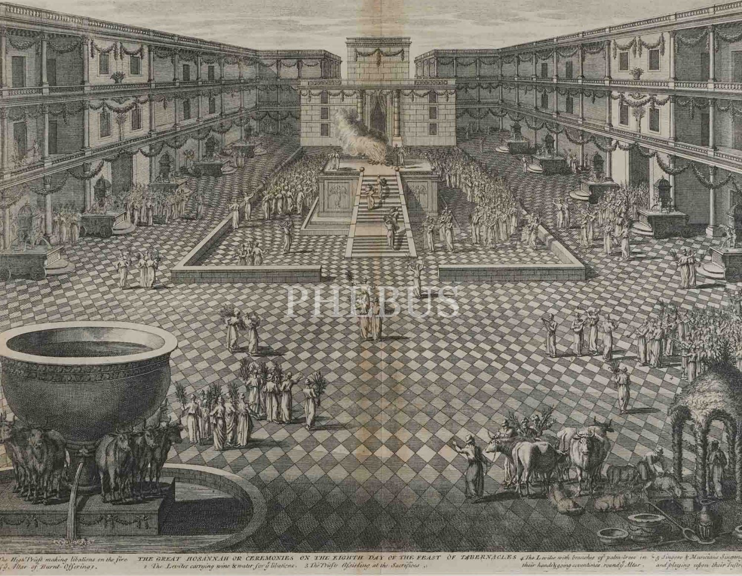 Çardaklar Bayramı olarak bilinen Sukkot'un sekizinci yani son gününde gerçekleştirilen "Hoshanot" ritüeli, "The Great Hosannah or Ceremonies on the Eighth Day of the Feast of Tabernacles", 1700'ler, çerçevesiyle birlikte 53x43 cm...