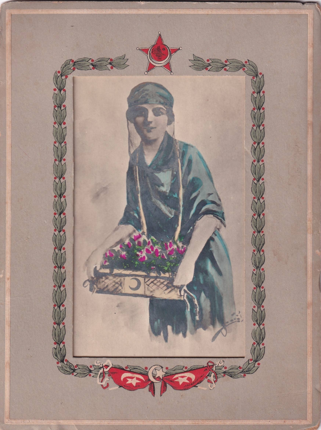 Ortasında Hilal-i Ahmer yaranına ürün satan hanımefendi kartpostalı bulunmaktadır