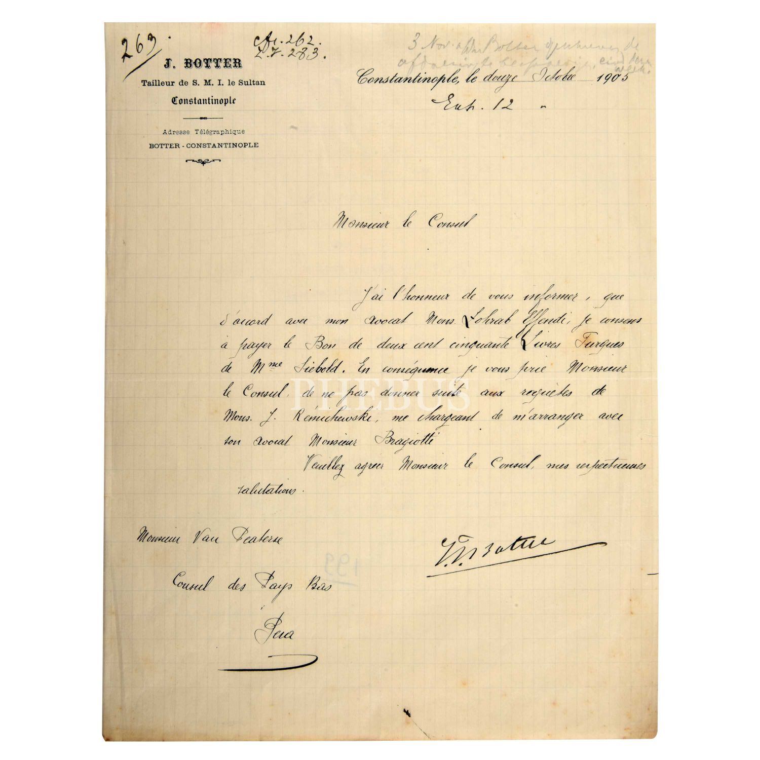 Sultan II. Abdülhamid´in ve sarayın terzisi Jean Botter´in, Hollanda´nın İstanbul Konsolosuna hitaben mağaza antetini taşıyan kâğıda yazdığı, 1905 tarihli, ıslak imzalı mektubu...