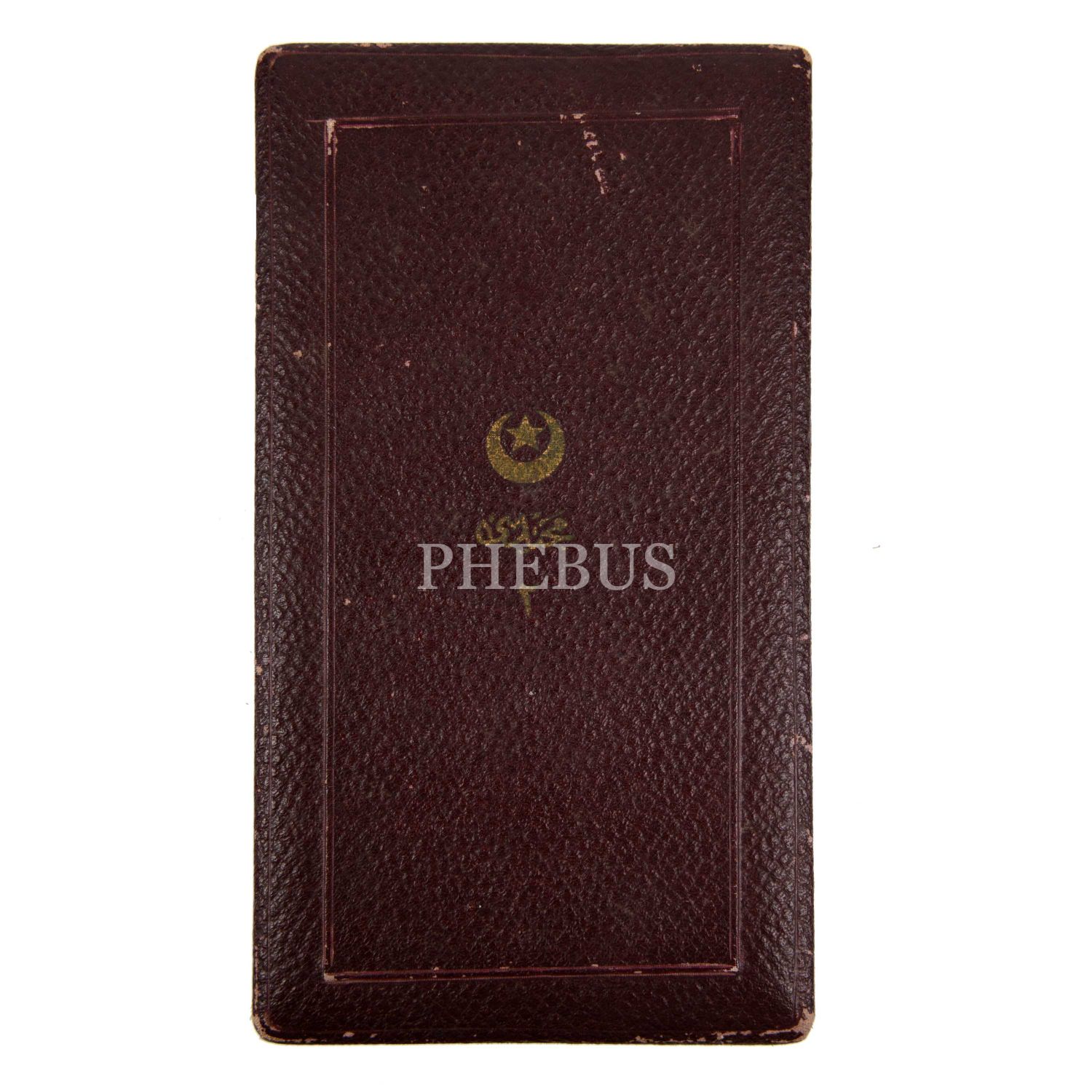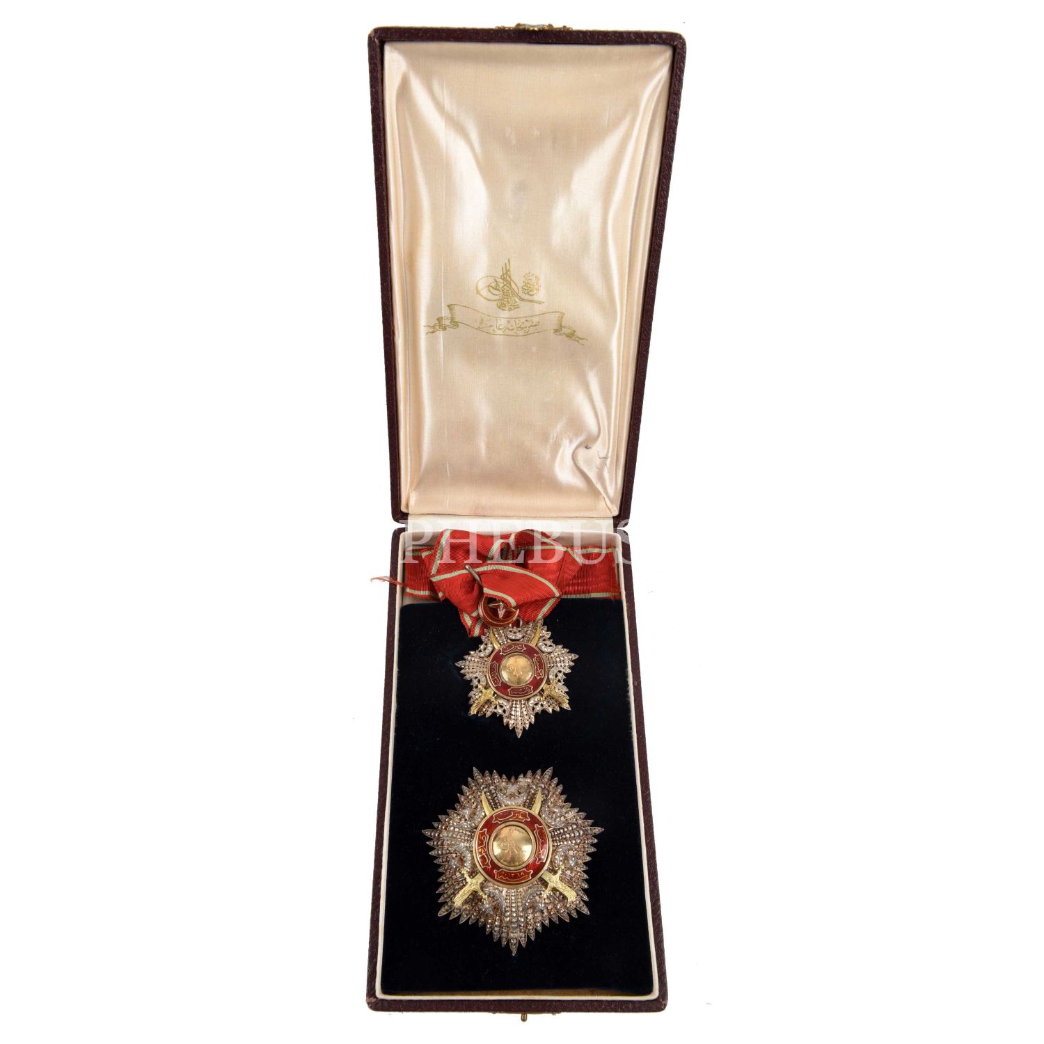 Kılıçlı Mecidi Nişanı (İkinci Derece), şemsesi ve nişan-şemse kuşakları, kapağı "Mecidi 2", iç kapağı Sultan V. Mehmed Reşad tuğrası görselli ve "Darphane-i Âmire" ibareli orijinal kutusunda, nişan 9 cm, şemse 6,5 cm, kutu 14x25,3,5 cm...