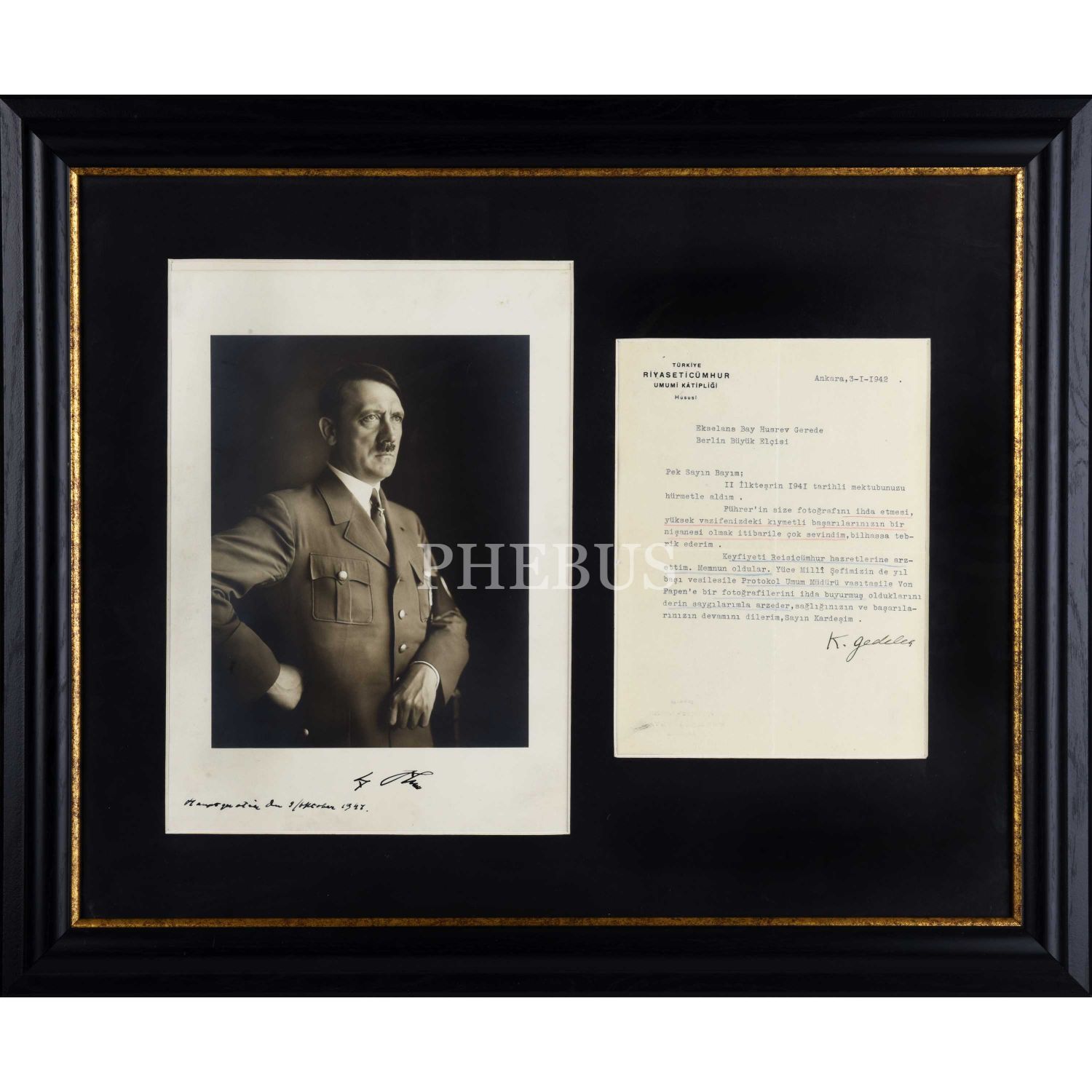 Adolf Hitler'den Berlin Büyükelçisi Hüsrev Gerede'ye imzalı fotoğraf ve Türkiye Riyaseticümhurunun cevabi mektubu... Fotoğraf (paspartusuyla birlikte) 21x19 cm, mektup 16x22 cm, çerçeve 58x48 cm...