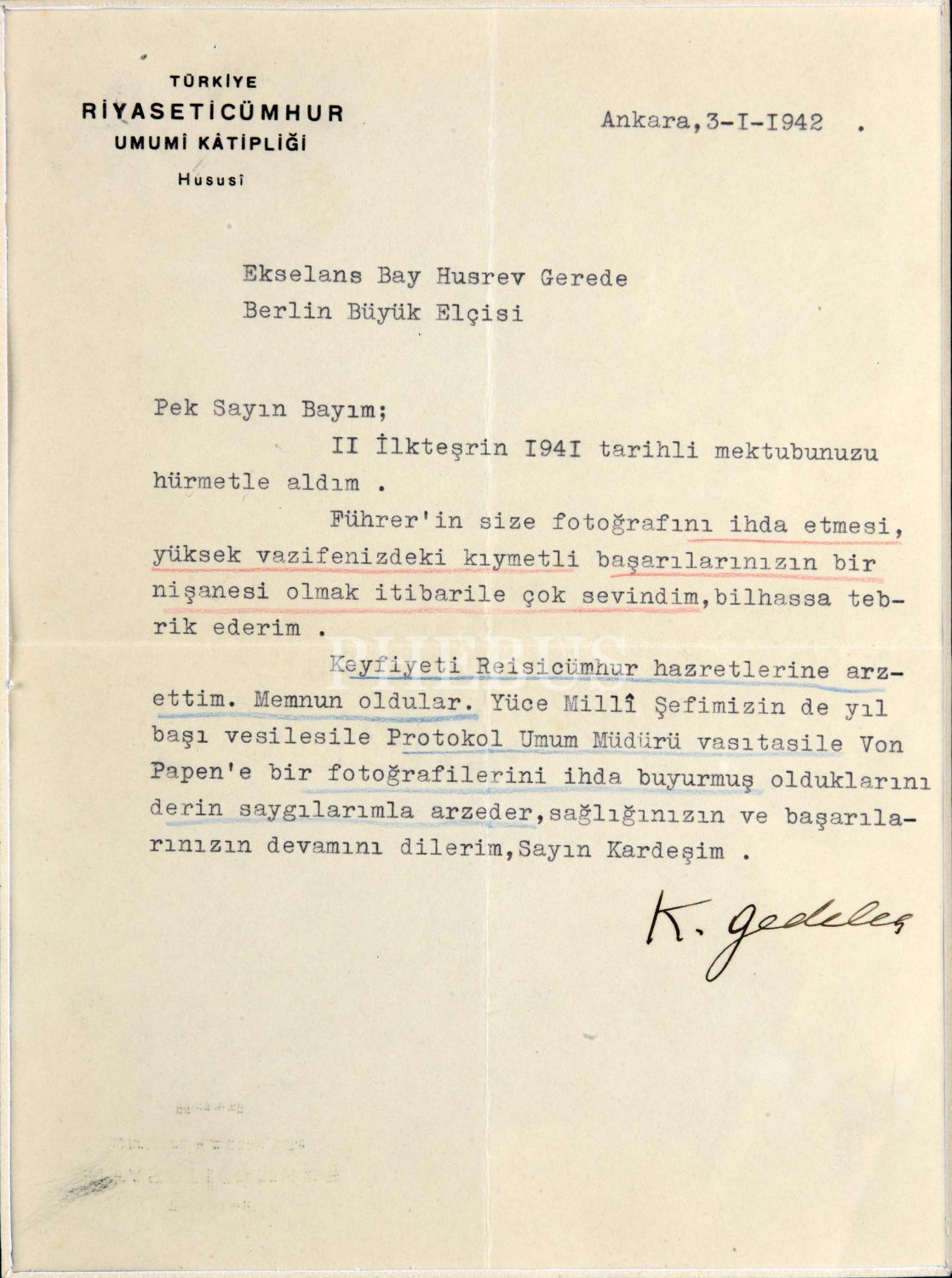 Adolf Hitler´in 1939-1942 yılları arasında Berlin´de büyükelçi olarak görev yapan Hüsrev Gerede´ye imzalı bir fotoğraf hediye etmesi üzerine, Cumhurbaşkanlığı Genel Kâtibi Kemal Gedeleç´in, Hüsrev Bey´e hitaben kaleme aldığı, tebriklerini ilettikten sonra İsmet İnönü´nün de bu diplomatik jeste karşılık olarak, yılbaşı vesilesiyle Türkiye´deki Alman büyükelçisi Franz von Papen´e imzalı bir fotoğrafını ulaştırdığını bildirdiği mektubu...