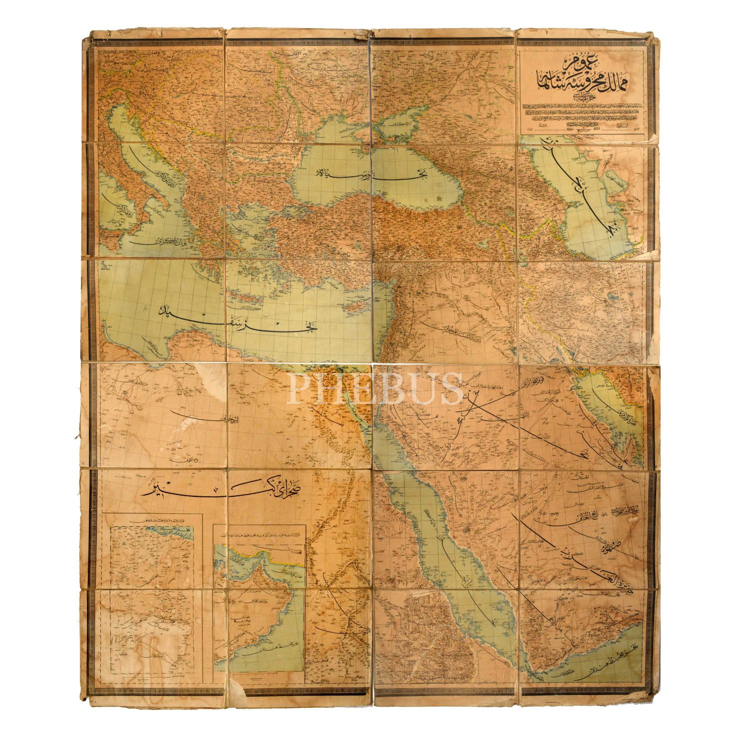 "Umum Memalik-i Mahruse-i Şahane Haritası" başlıklı, Mekteb-i Fünun-u Harbiye-i Şahane ressamlarından Kolağası Osman Enver, Yüzbaşı Bekir Sıtkı ve Kolağası Ahmet Cemal efendiler tarafından tersim edilen ve Mekteb-i Fünun-u Harbiye-i Şahane´de 1312 senesinde basılan harita, 128x152 cm...