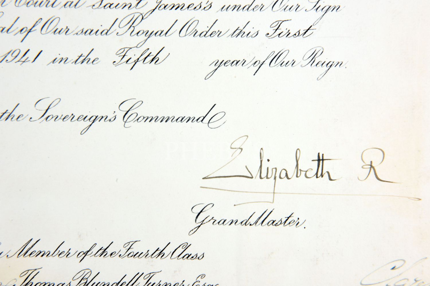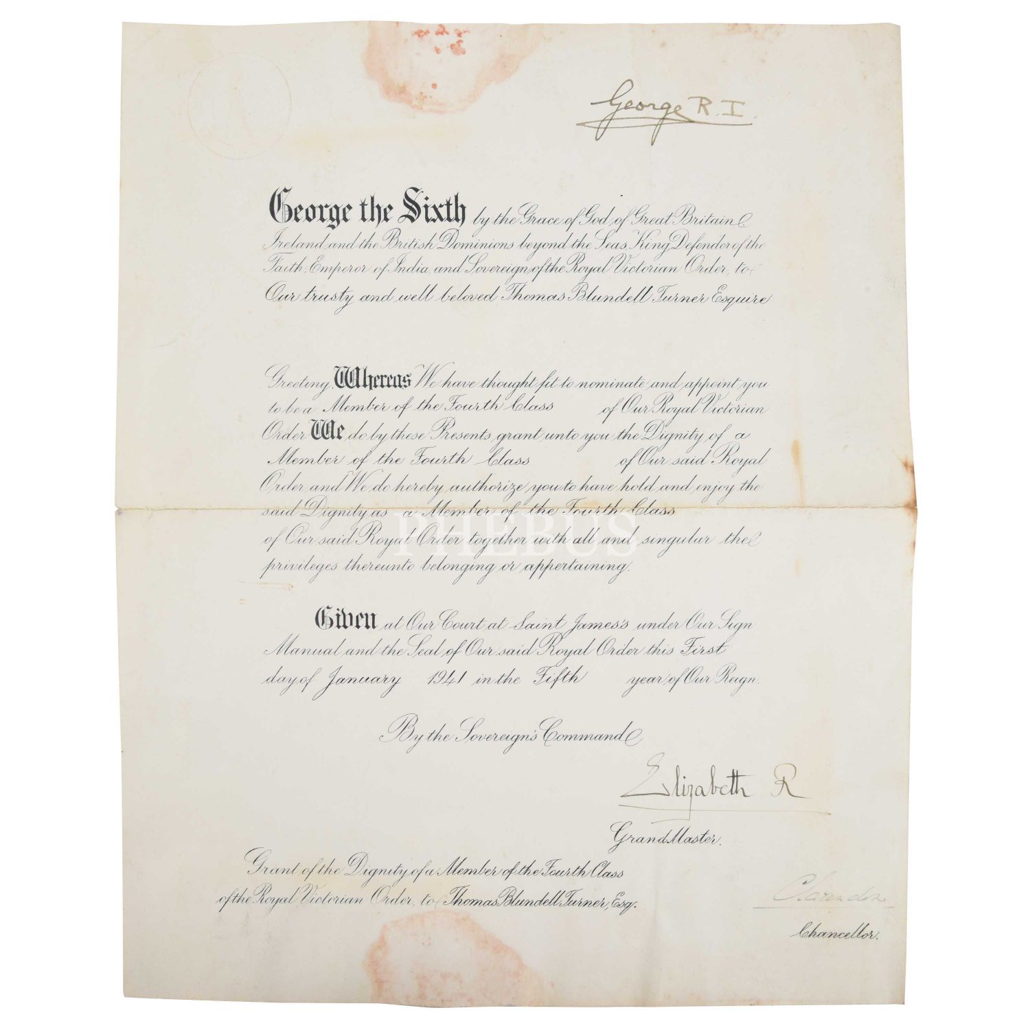 Kral VI. George ve eşi Elizabeth Bowes-Lyon´dan ıslak imzalı, Thomas Blundell Turner Esquise´e verilen Dördüncü Sınıf Kraliyet Nişanı´nın beratı, 1 Ocak 1941 tarihli, 32x39 cm...