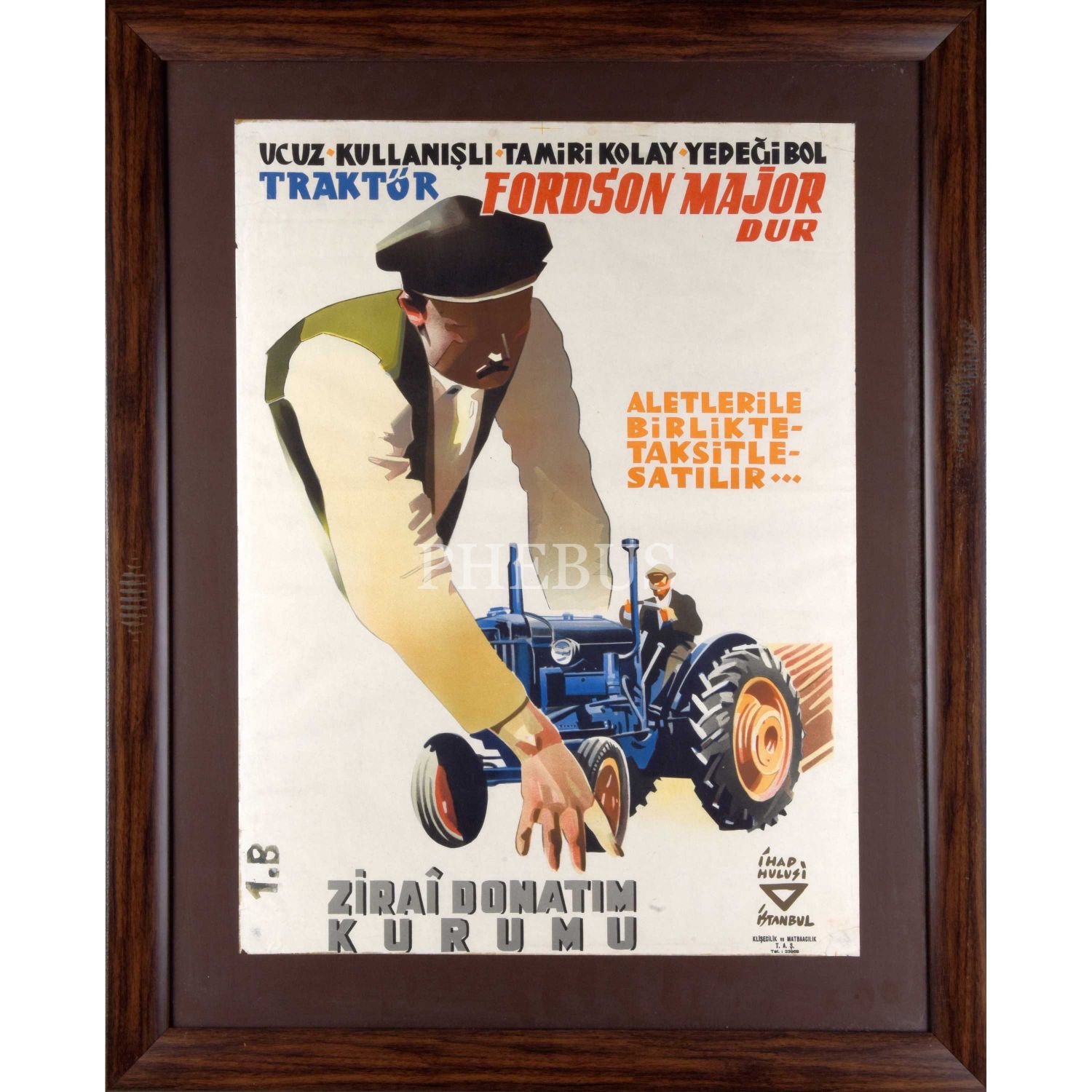 İhap Hulusi tasarımlı Ziraî Donatım Kurumu afişi, "Ucuz, Kullanışlı, Tamiri Kolay, Yediği Bol Traktör Fordson Major´dur; Aletlerile Birlikte, Taksitle Satılır...", Klişecilik ve Matbaacılık T.A.Ş., afiş 50x67 cm, çerçeve 71x87 cm...