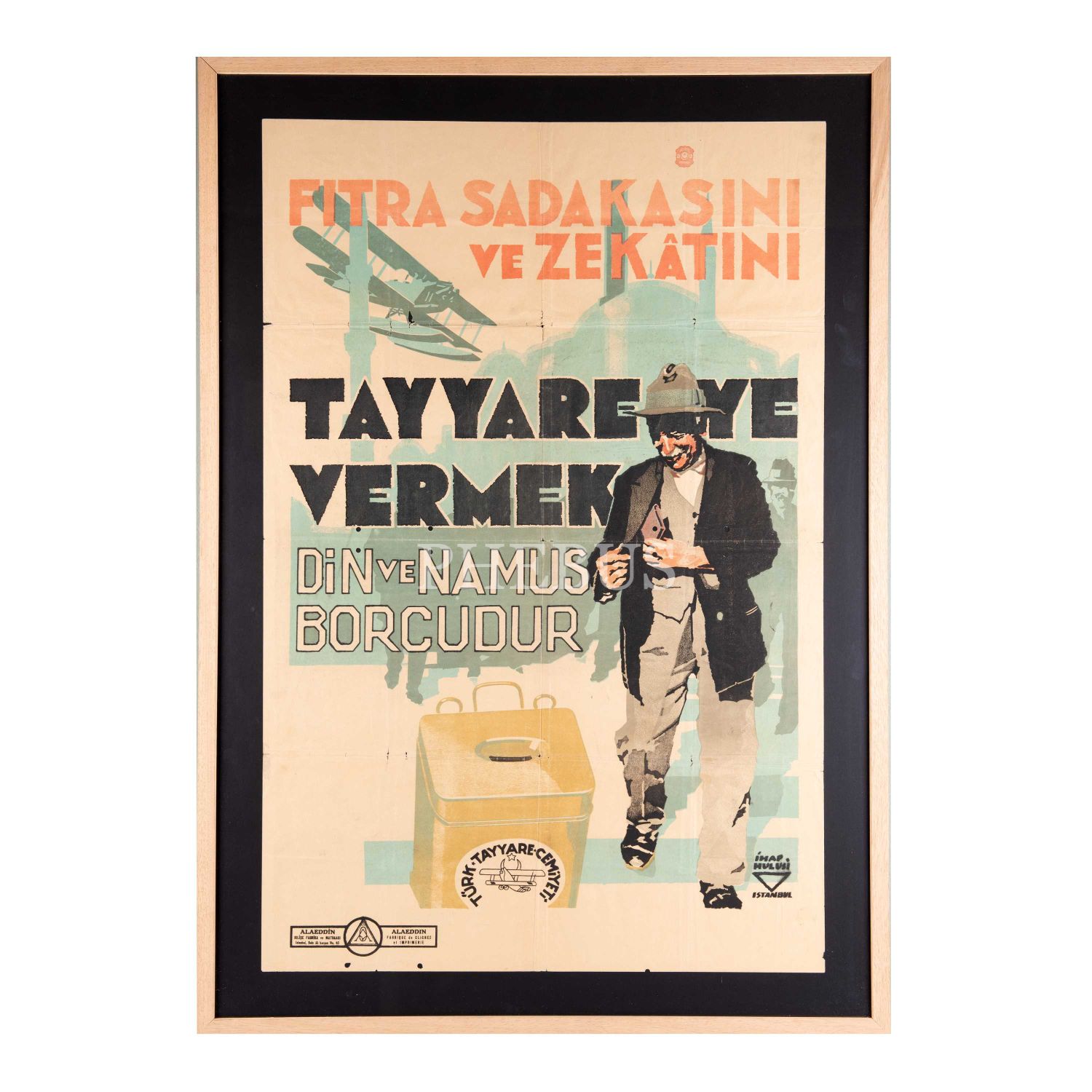 İhap Hulusi tasarımlı Türk Tayyare Cemiyeti afişi, "Fıtra Sadakasını ve Zekâtını Tayyareye Vermek Din ve Namus Borcudur", Alaeddin Klişe Fabrika ve Matbaası, afiş 62x94 cm, çerçeve 77x109 cm...