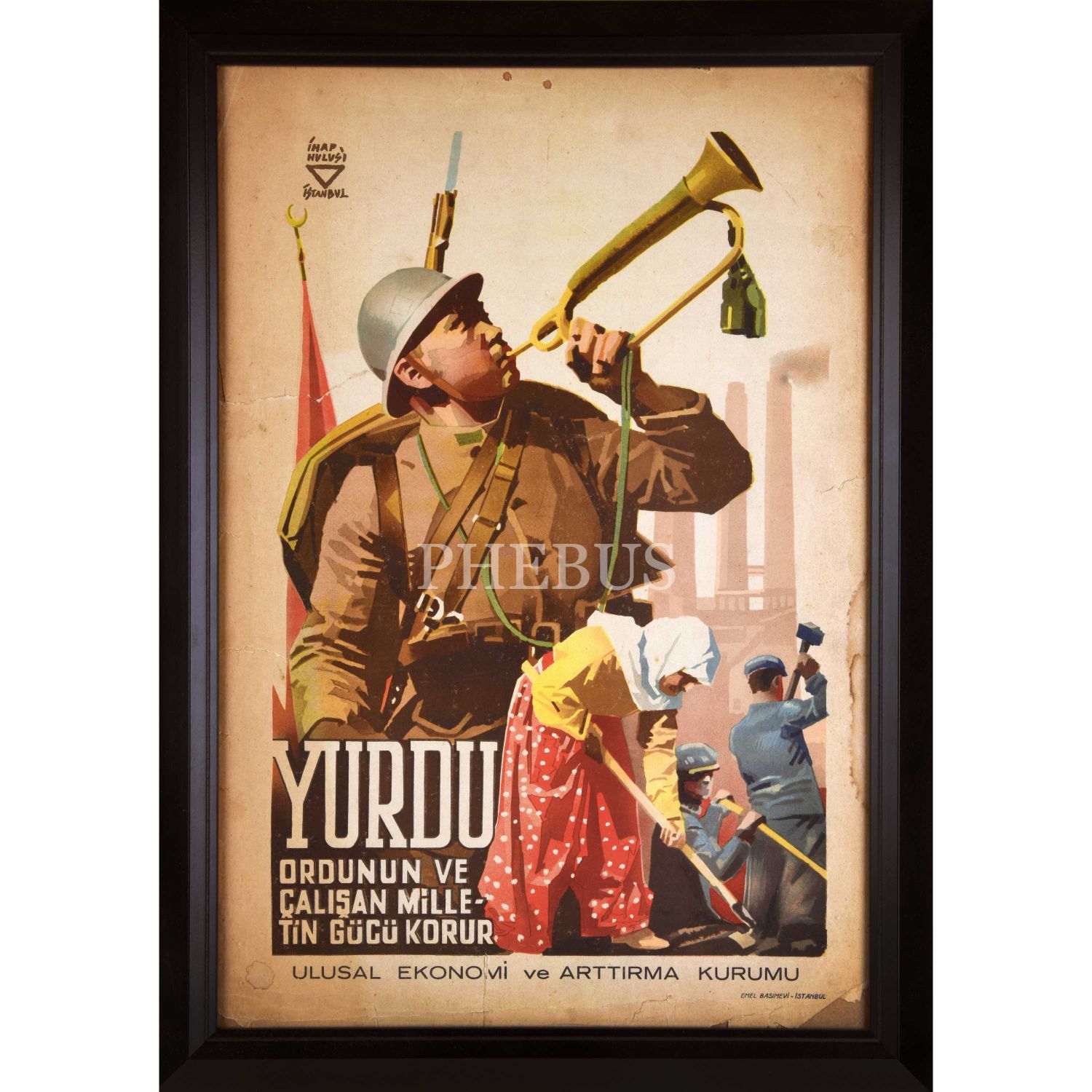 İhap Hulusi tasarımlı Ulusal Ekonomi ve Arttırma Kurumu afişi, "Yurdu Ordunun ve Çalışan Milletin Gücü Korur", Emel Basımevi - İstanbul, afiş 33x48 cm, çerçeve 40x56 cm...