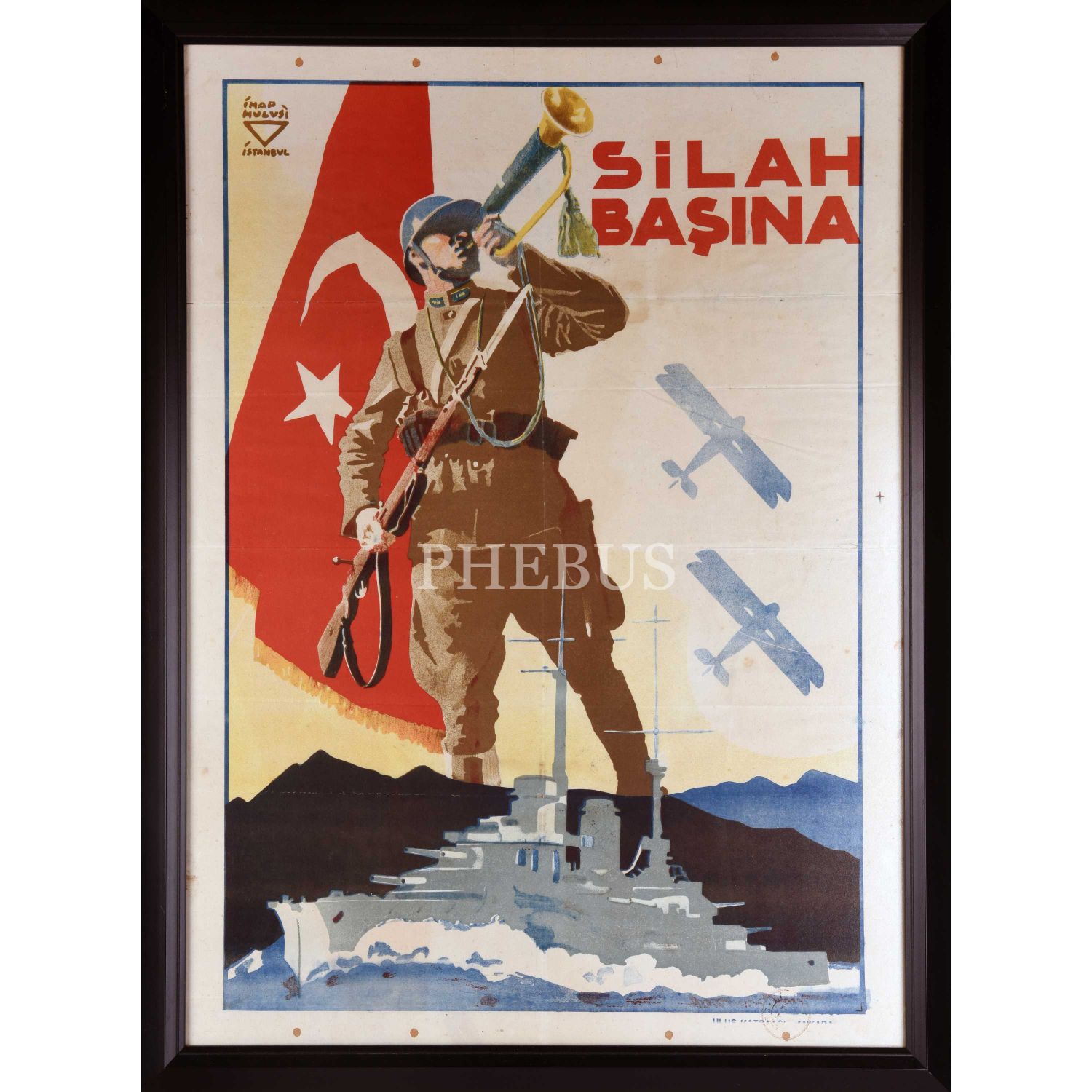 İhap Hulusi tasarımlı, İkinci Dünya Savaşı dönemi seferberlik çağrısı afişi, "Silah Başına", Ulus Matbaası - Ankara, afiş 49x67 cm, çerçeve 56x74 cm...