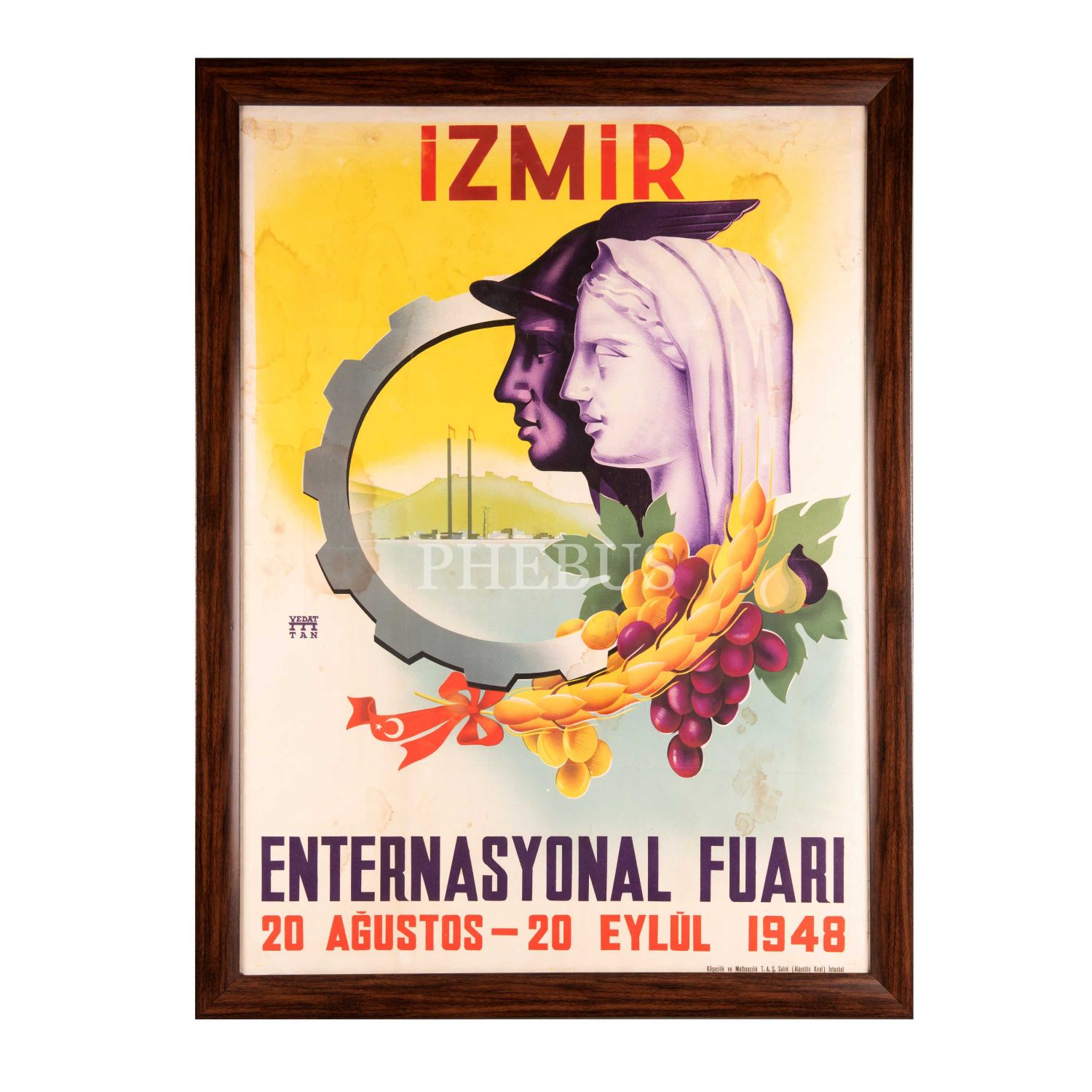 Vedat Tan tasarımlı "İzmir Enternasyonal Fuarı (20 Ağustos - 20 Eylül 1948)" afişi, Klişecilik ve Matbaacılık T.A.Ş. (Alâeddin Kıral) - İstanbul, çerçevesiyle birlikte 79x109 cm...