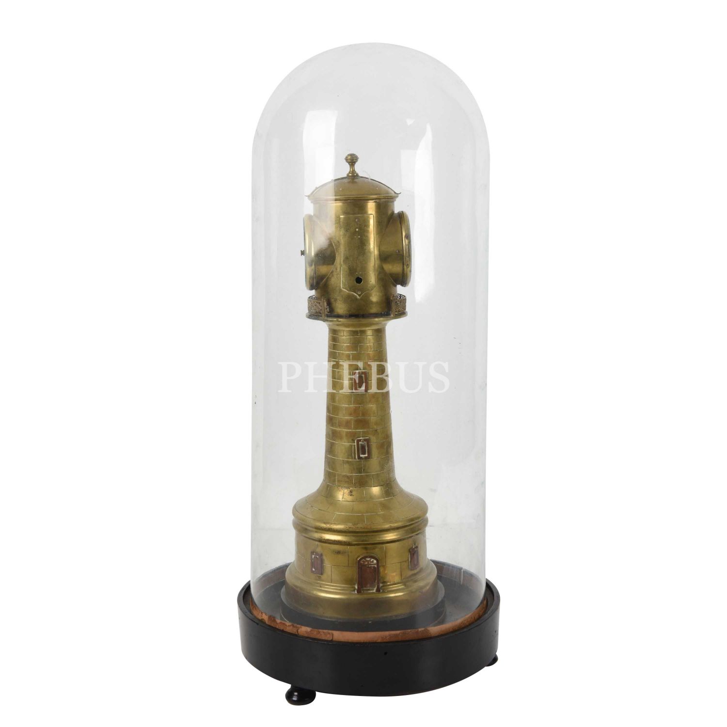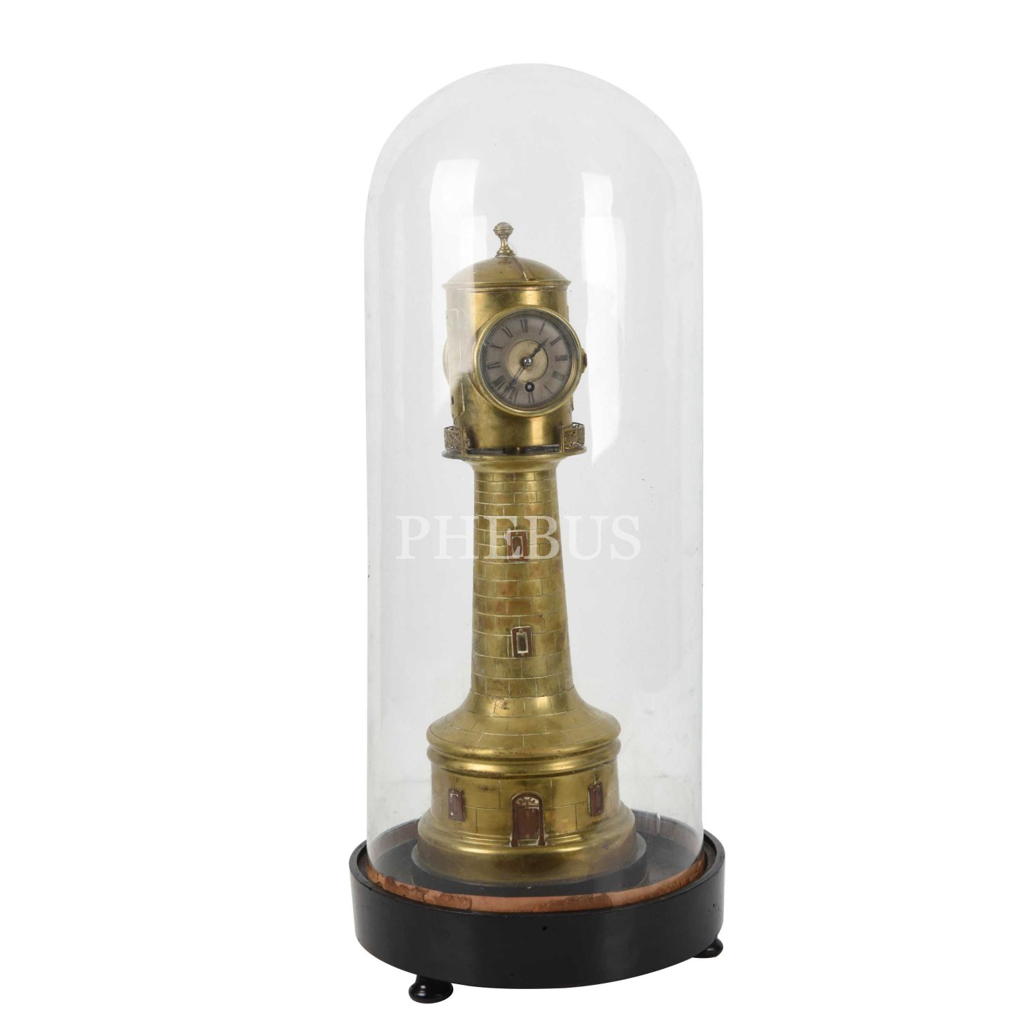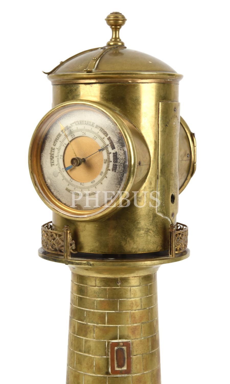 19. yüzyıl sonlarından, Fransa üretimi pirinç deniz feneri saati... Saat, aneroid barometre ve sıcaklıkları Santigrat ve Fahrenheit birimlerinde gösteren ikiz termometre bulunan fener odası kurma anahtarıyla otomatik olarak dönebilmektedir, ahşap kaideli cam fanus içinde, saat 43x16 cm, kaide 25x6 cm, 52x22 cm...