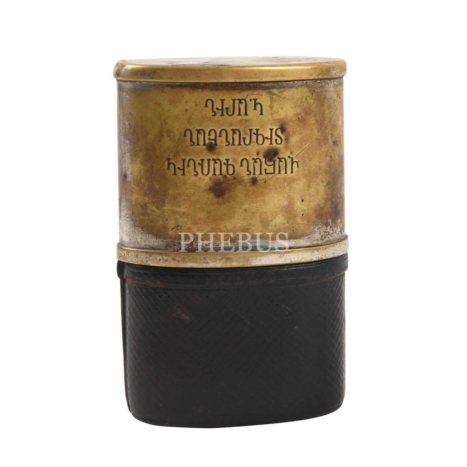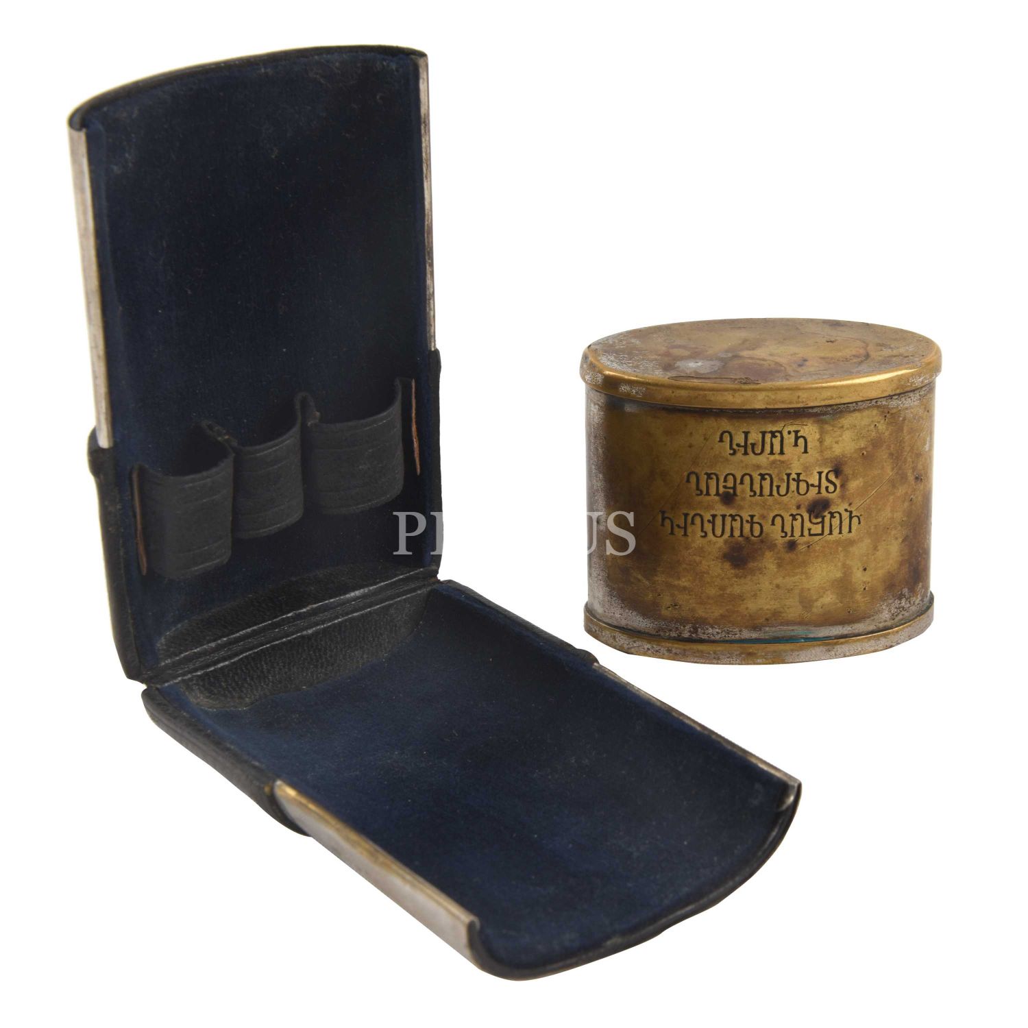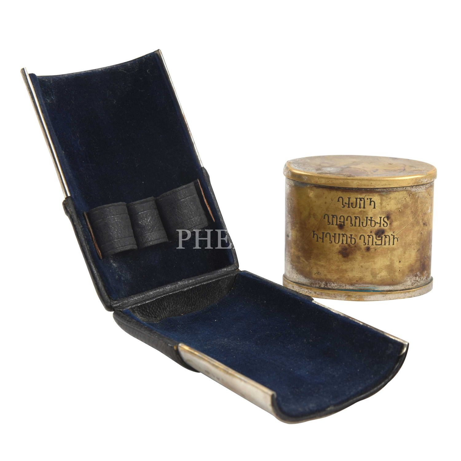 Üzeri Ermenice "Vahan Karnig Dikranyan - Erzurum" ibareli, içi kadife kaplı ve deri kalem yataklı (3 kalemlik), pirinç kabzalı ve deri kaplamalı kalem kılıfı, kapalı halde 6x9,5x3,5 cm, açık halde 19x6x1,5 cm...