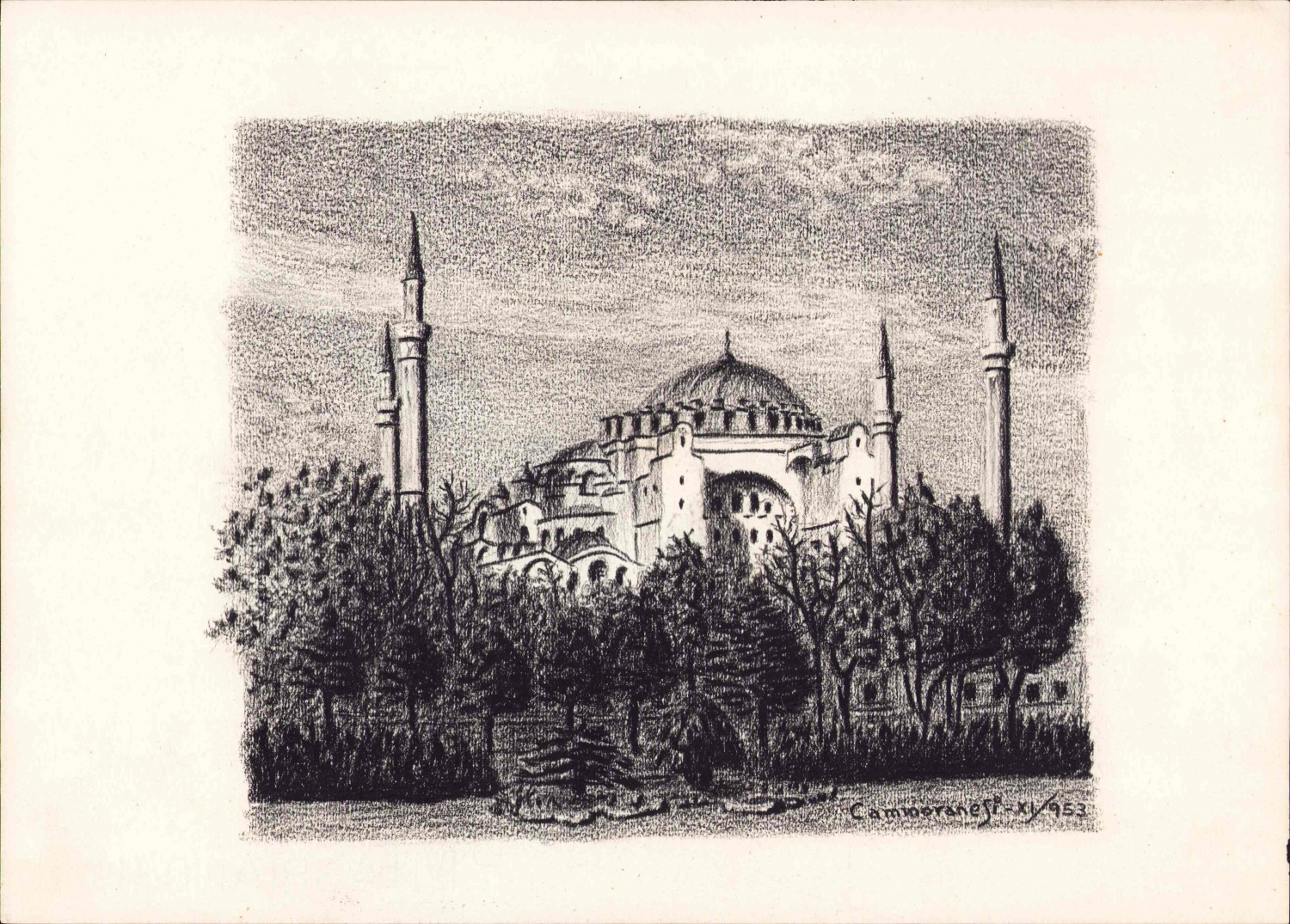 Ayasofya Camii, 1953 sanatçı imzalı pastel boya resim, 1953, 33x22 cm