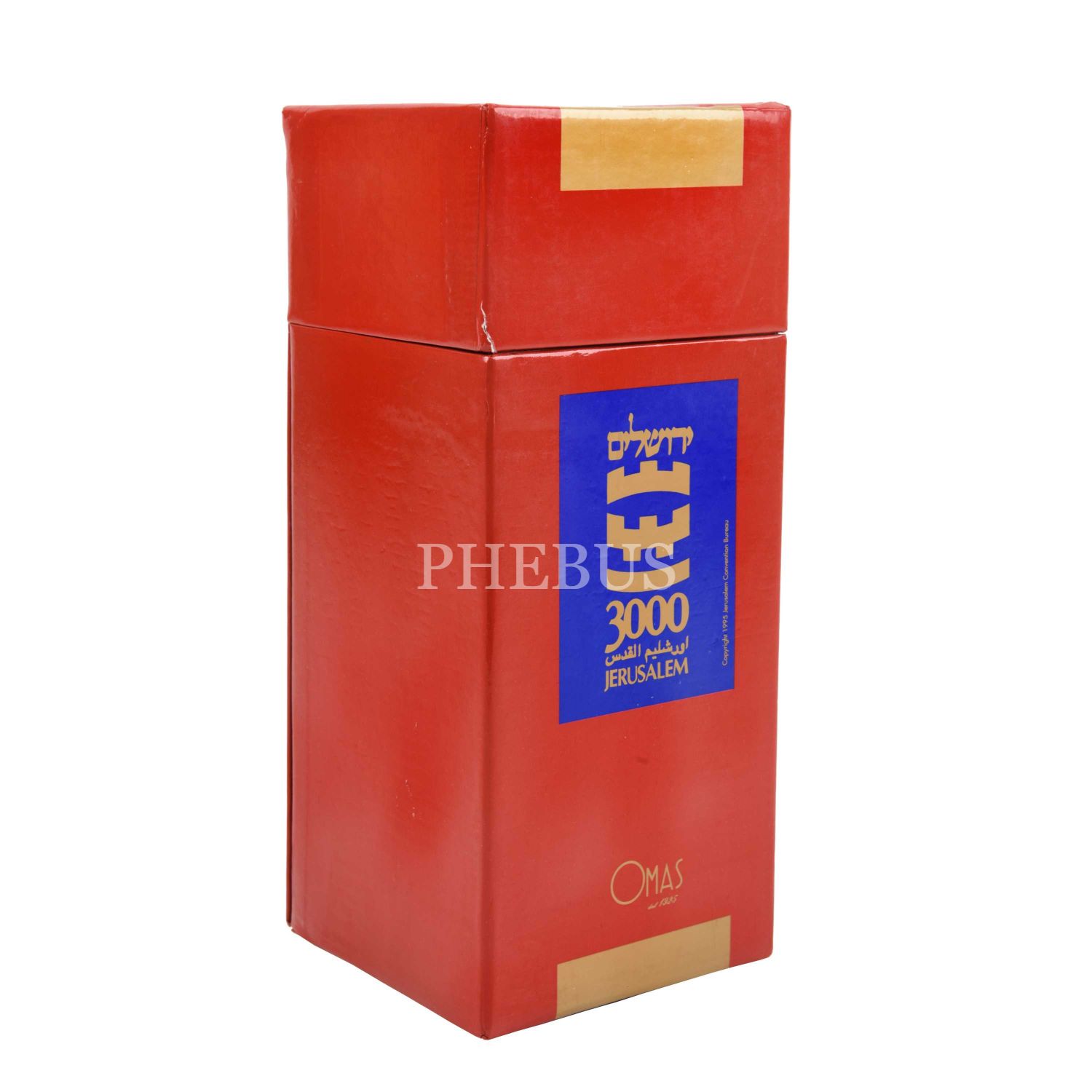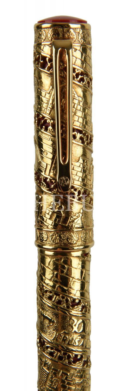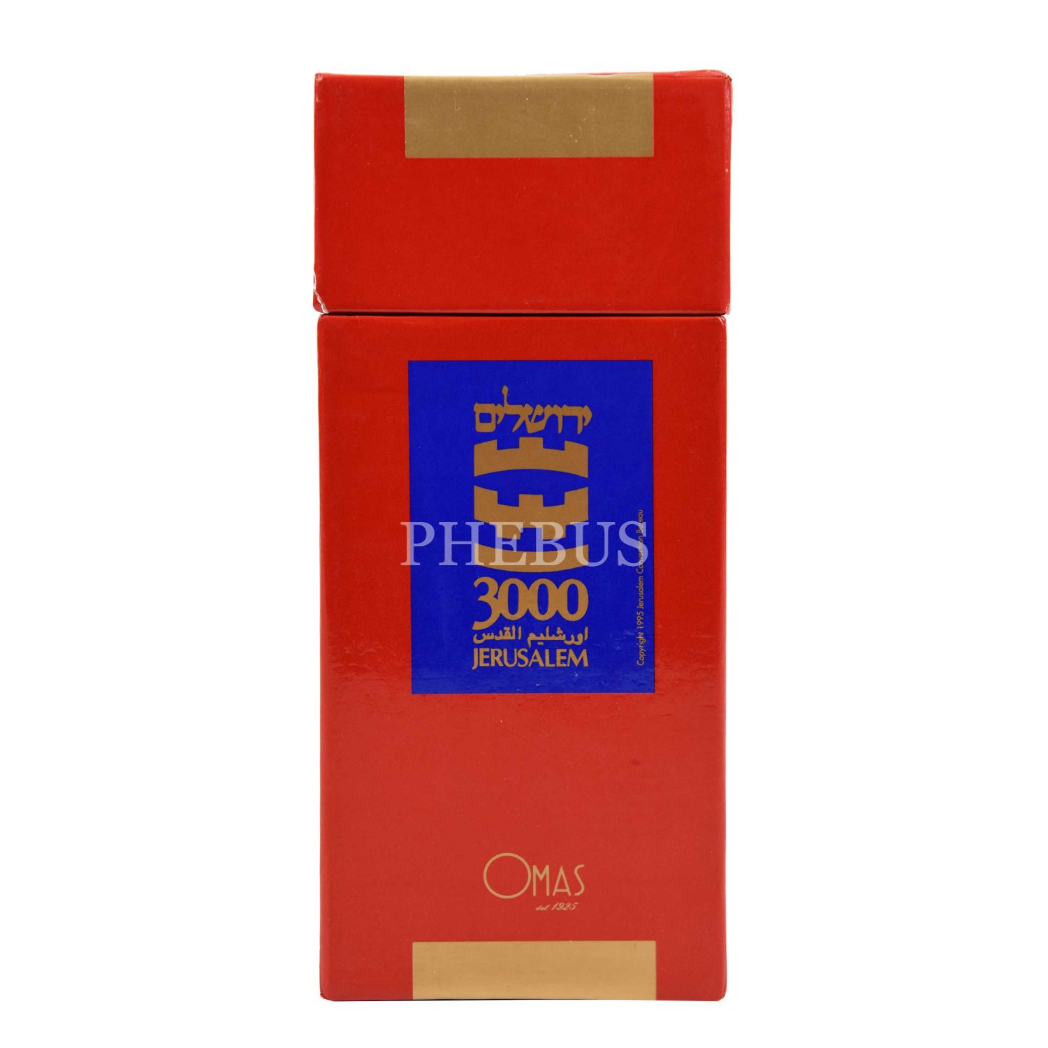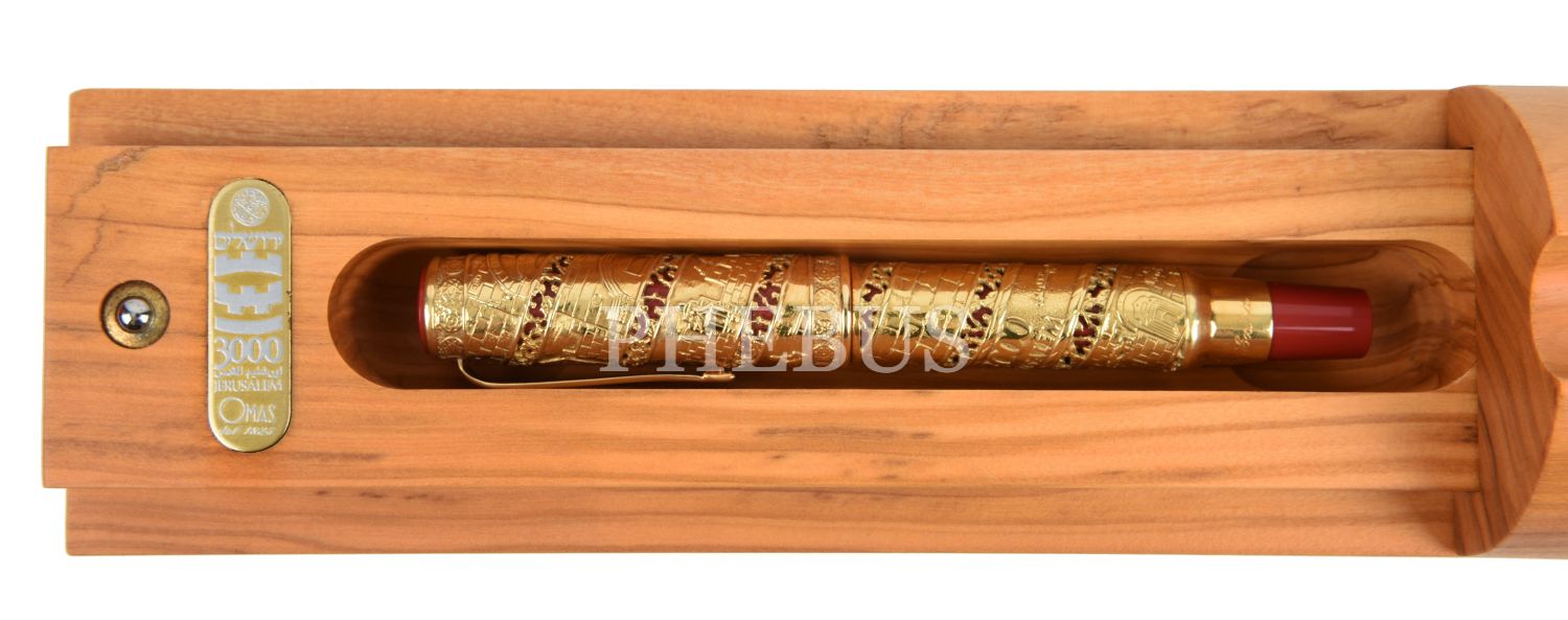 Kudüs Belediyesi ve İtalyan kalem üreticisi OMAS işbirliği ile Kudüs şehrinin kuruluşunun 3000. yılı anısına yalnızca 500 adet üretilen, 18 ayar altın dolma kalem: JERUSALEM 3000 (F). OMAS´ın yöneticisi Rafaella Simoni Bernardi Malaguti´nin ıslak imzasını ve edisyon numarasını (186/500) taşıyan sertifikanın, tanıtım kitapçığının ve zeytin ağacından yapılmış, kızak sistemiyle açılan özel dolma kalem yastığının yer aldığı orijinal kutusunda... Kalem 14 cm, kalem yastığı 23x7 cm, kutu 10x25x10 cm, kalemin ağırlığı 92 gr...