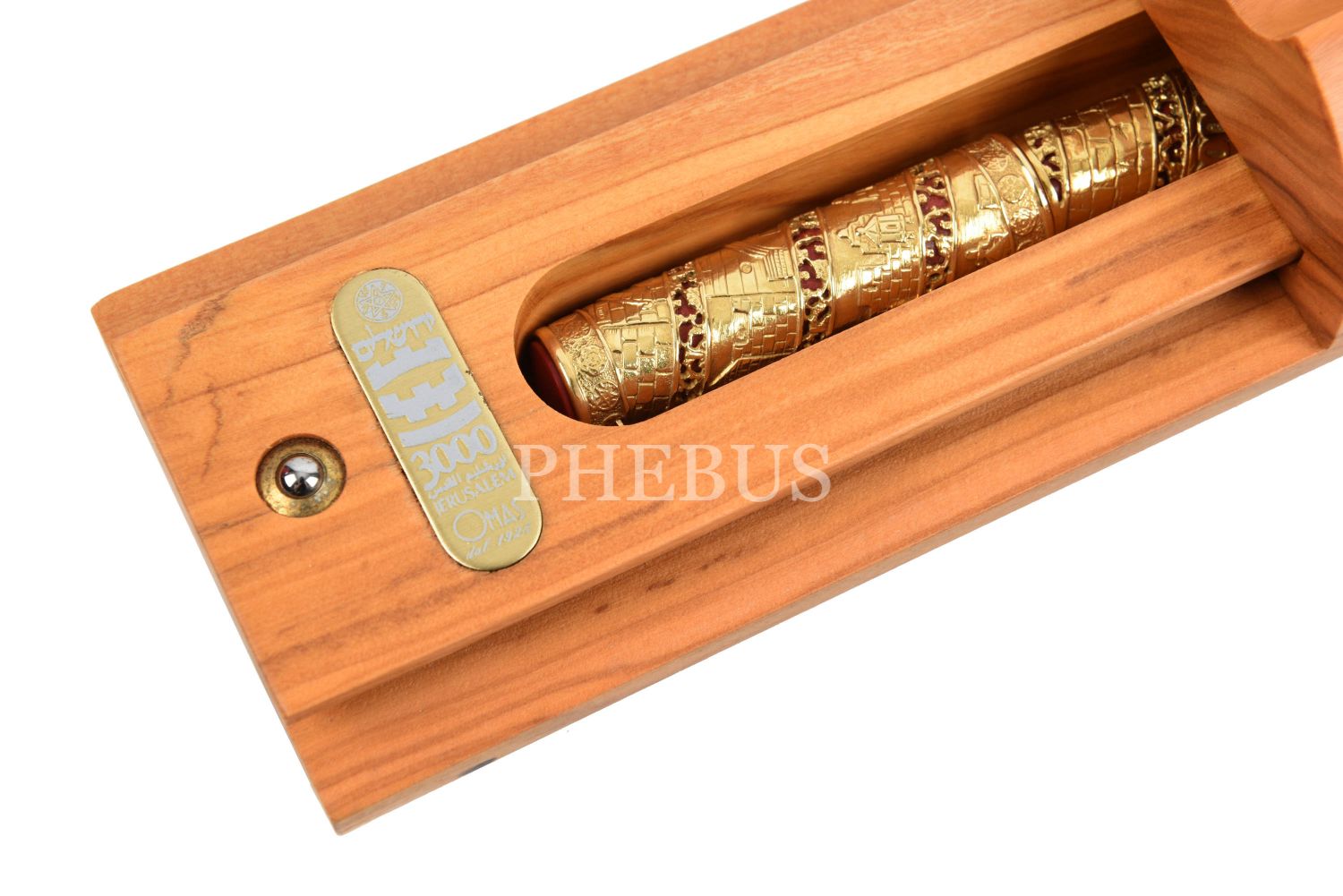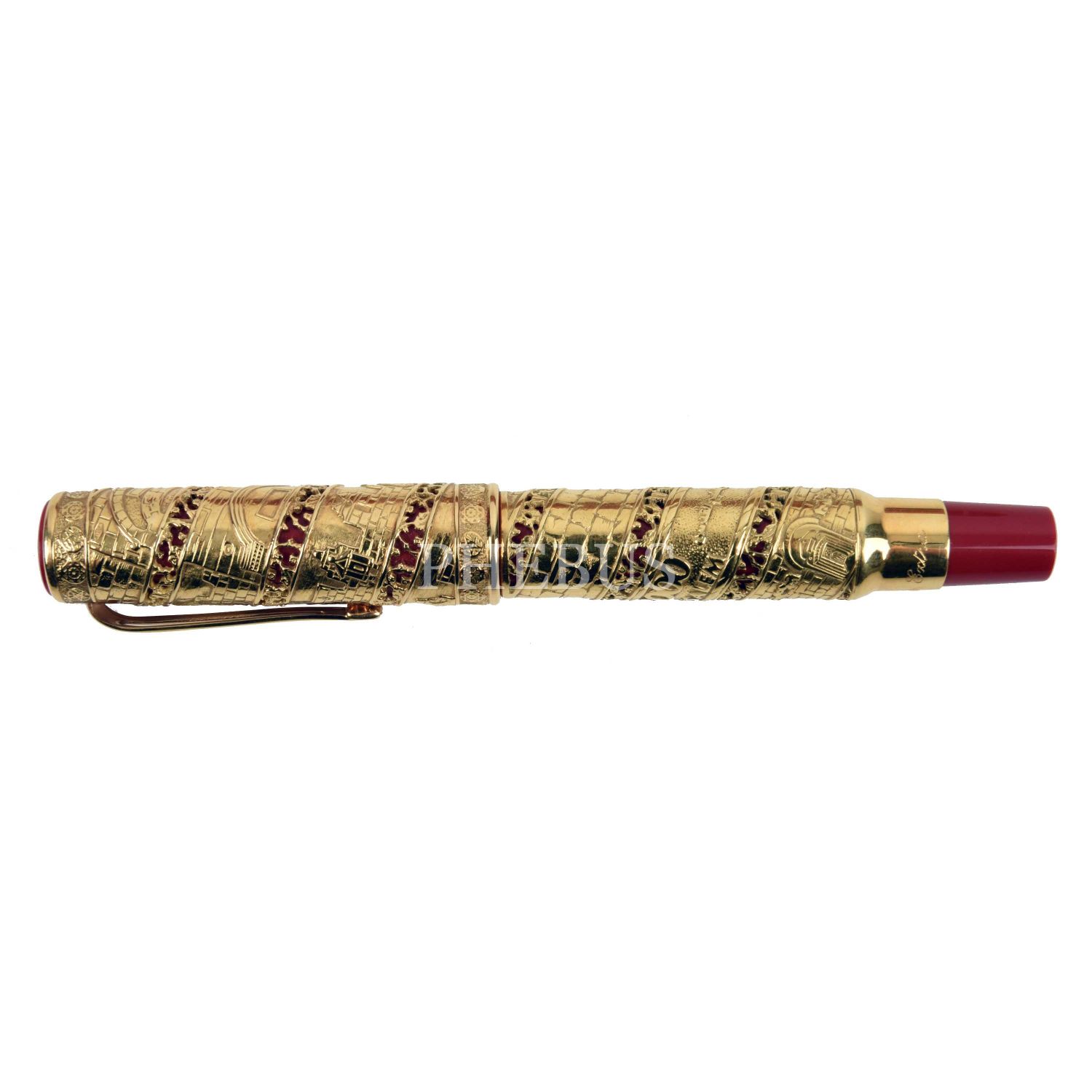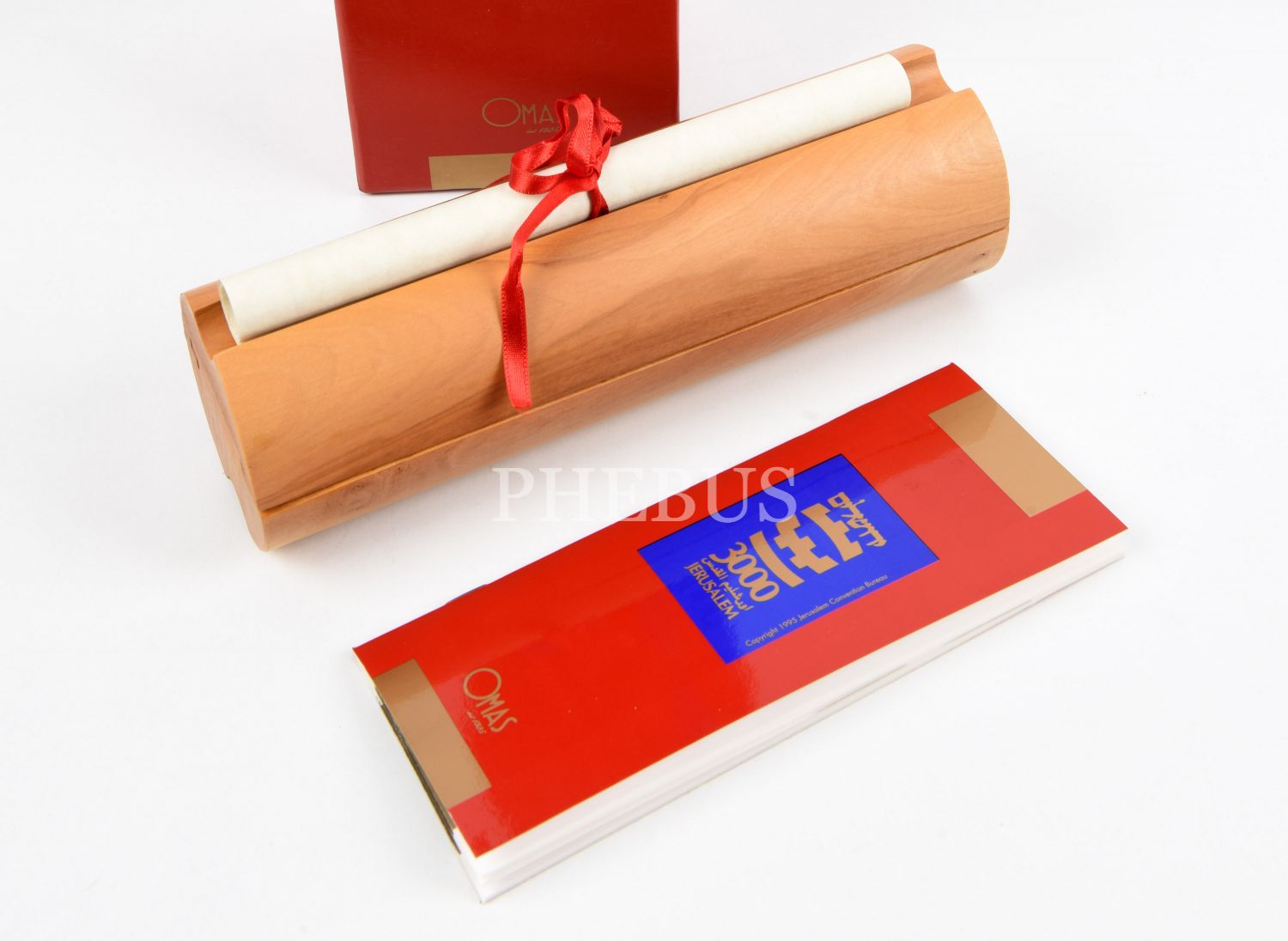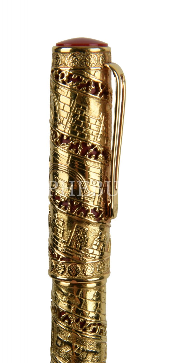 Kudüs Belediyesi ve İtalyan kalem üreticisi OMAS işbirliği ile Kudüs şehrinin kuruluşunun 3000. yılı anısına yalnızca 500 adet üretilen, 18 ayar altın dolma kalem: JERUSALEM 3000 (F). OMAS´ın yöneticisi Rafaella Simoni Bernardi Malaguti´nin ıslak imzasını ve edisyon numarasını (186/500) taşıyan sertifikanın, tanıtım kitapçığının ve zeytin ağacından yapılmış, kızak sistemiyle açılan özel dolma kalem yastığının yer aldığı orijinal kutusunda... Kalem 14 cm, kalem yastığı 23x7 cm, kutu 10x25x10 cm, kalemin ağırlığı 92 gr...