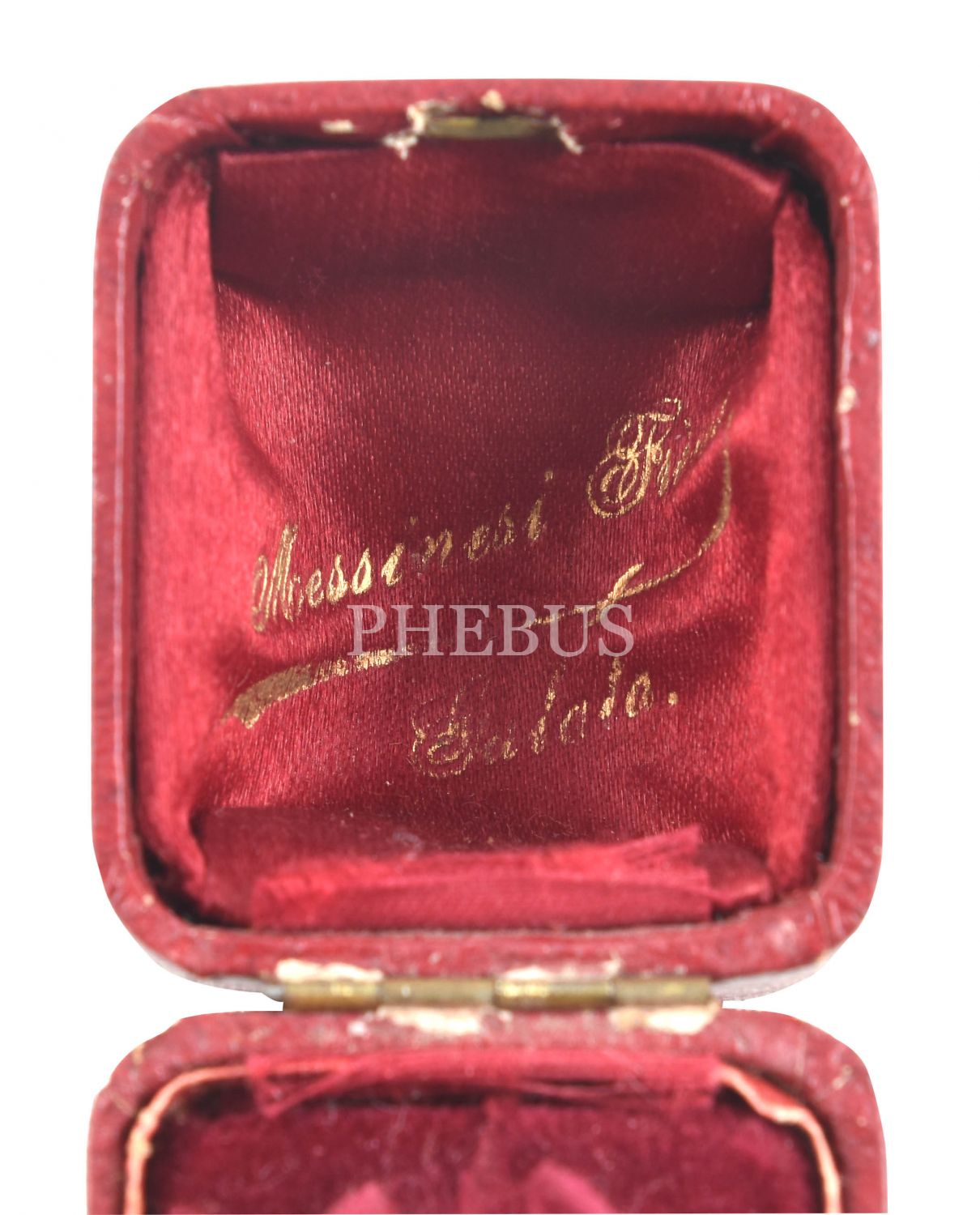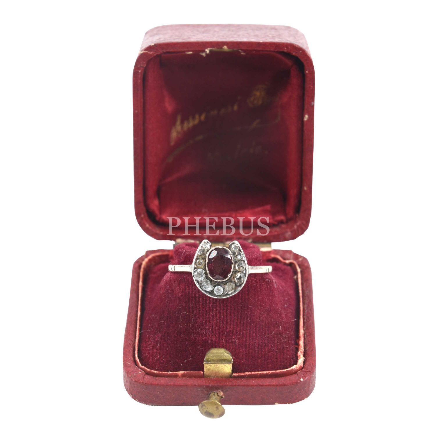 Osmanlı döneminden, 8 ayar altın üzerine elmas ve yakut taş montürlü yüzük, "Messinesi Freres - Galata" ibareli orijinal kutusunda, yüzük (çap) 2 cm, kutu 4x4,5x3,5 cm...