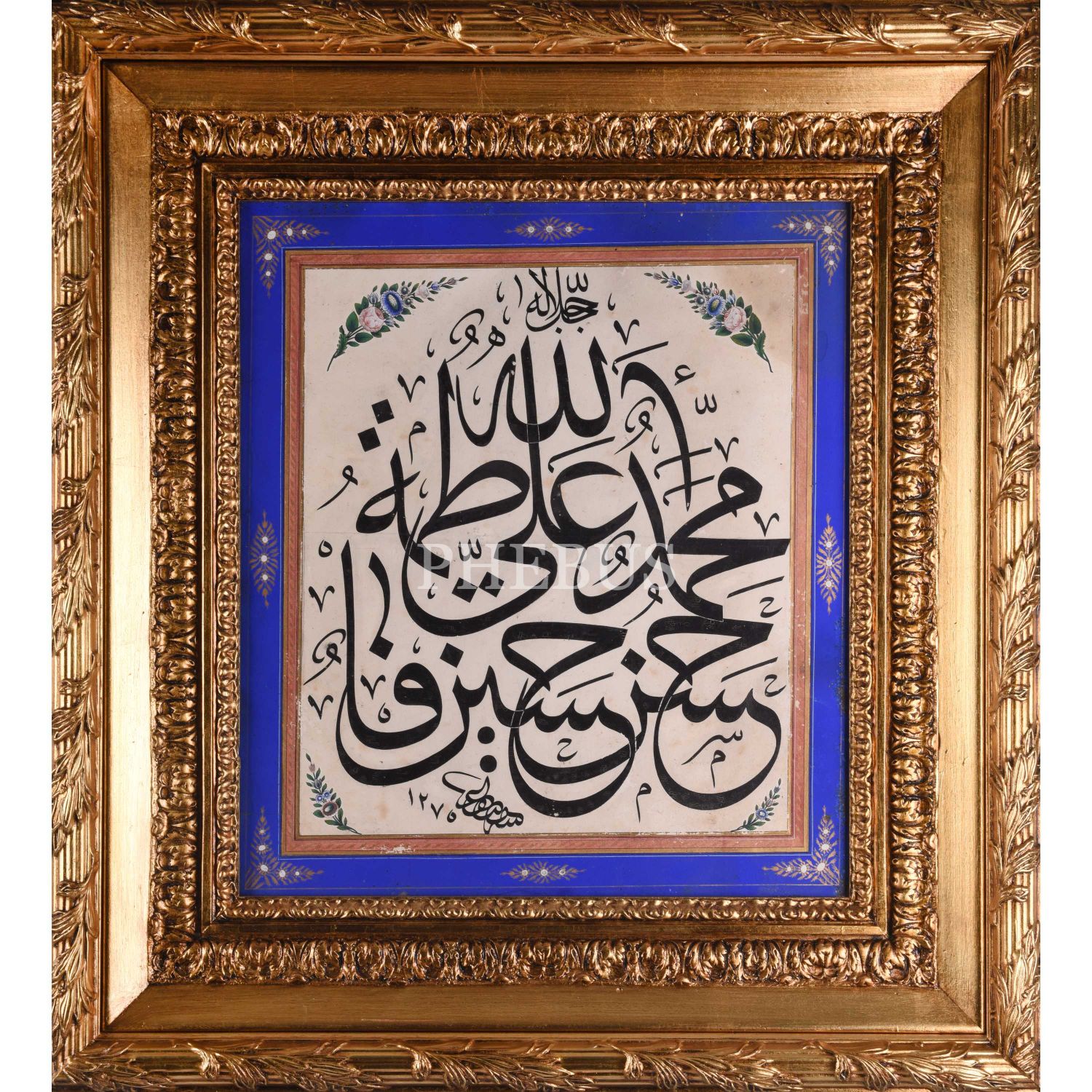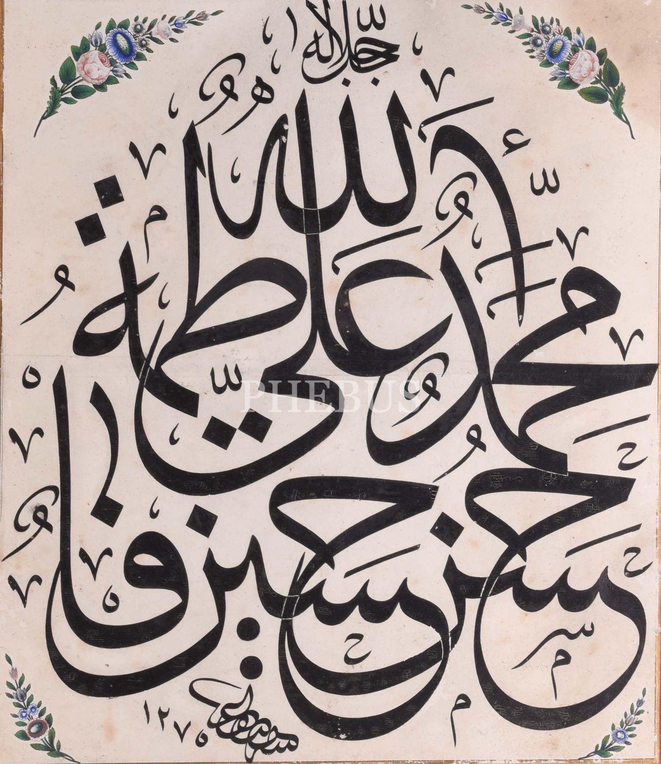 Kazasker Mustafa İzzet Efendi Dönem Kalıbı Celi Sülüs Hamse-yi Âl-i Aba Levhası, 1275 tarihli, çerçeve içi ölçü: 36x55 cm...