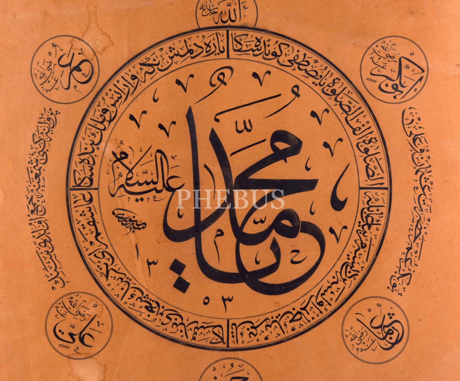 Ortada celi sülüs yazı ile "Ya Muhammed a.s", dört köşede sülüs yazı ile hulefâ-i râşidîn´in isimleri, üste "Allah c.c.", altta "Hasan ve Hüseyin r.a" isimleri yazılıdır.