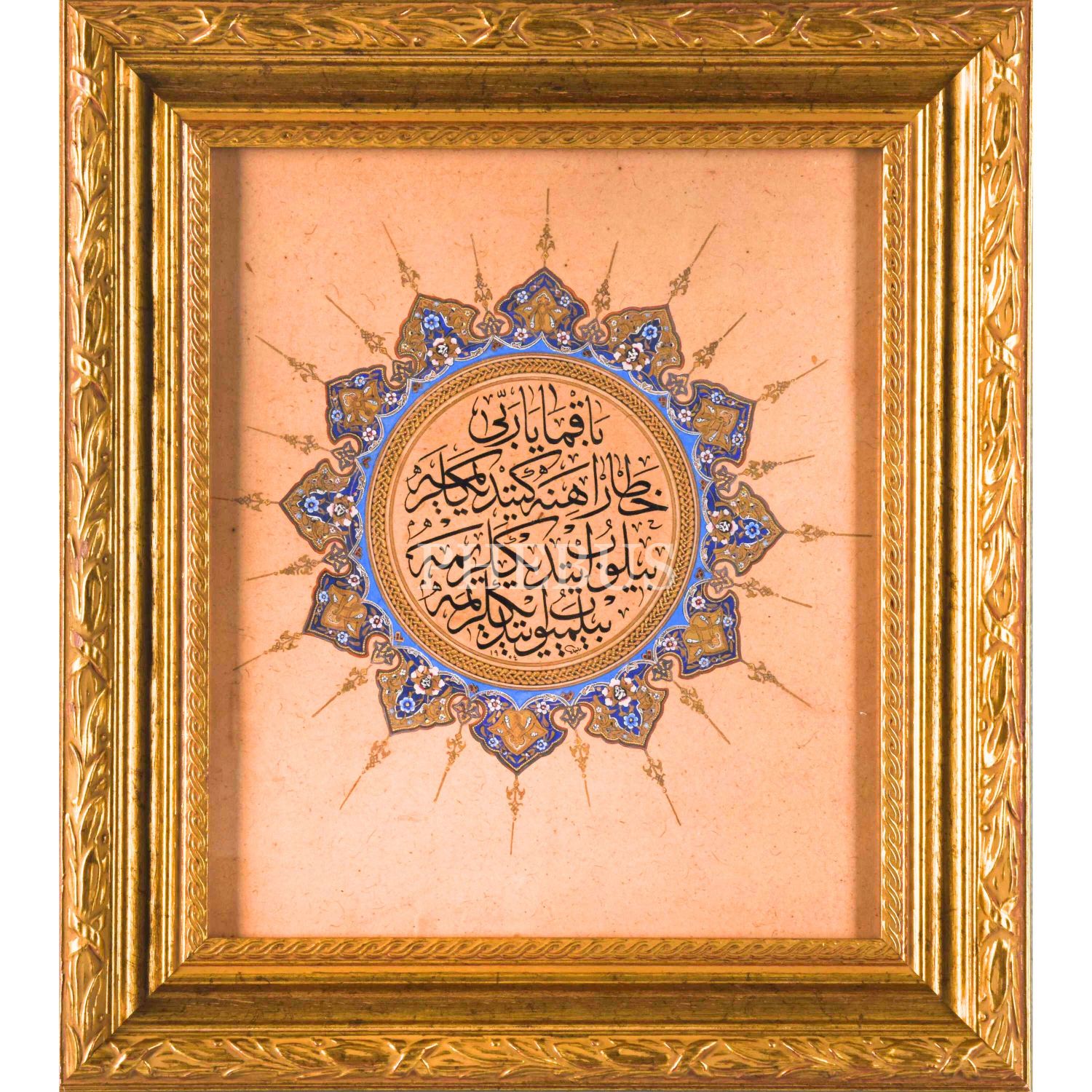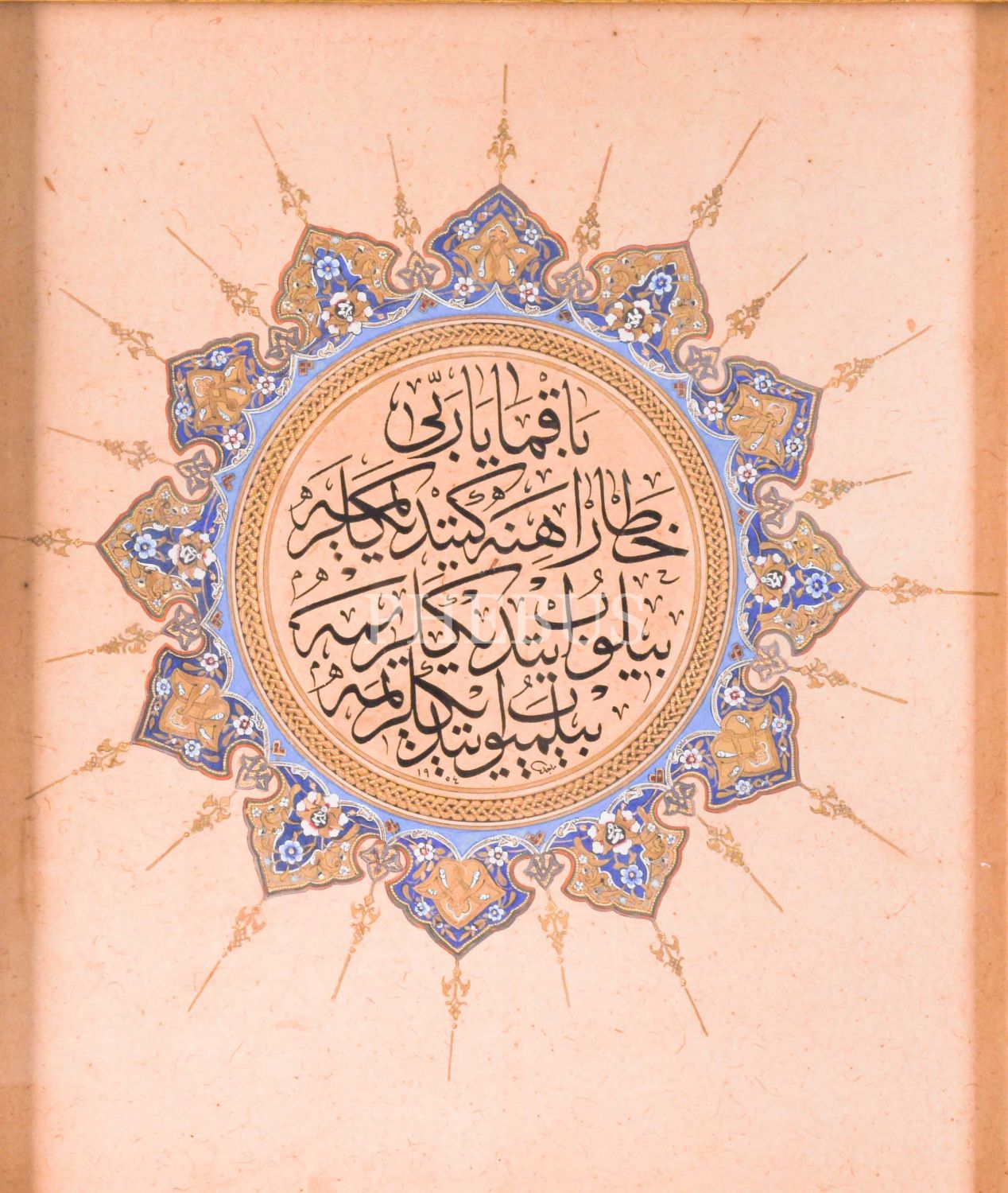 Macid Ayral ketebeli istif sülüs beyit, 1954 tarihli, döneminde yapılmış altın tezhipli, çerçeve içi ölçü: 28x24 cm...