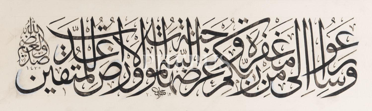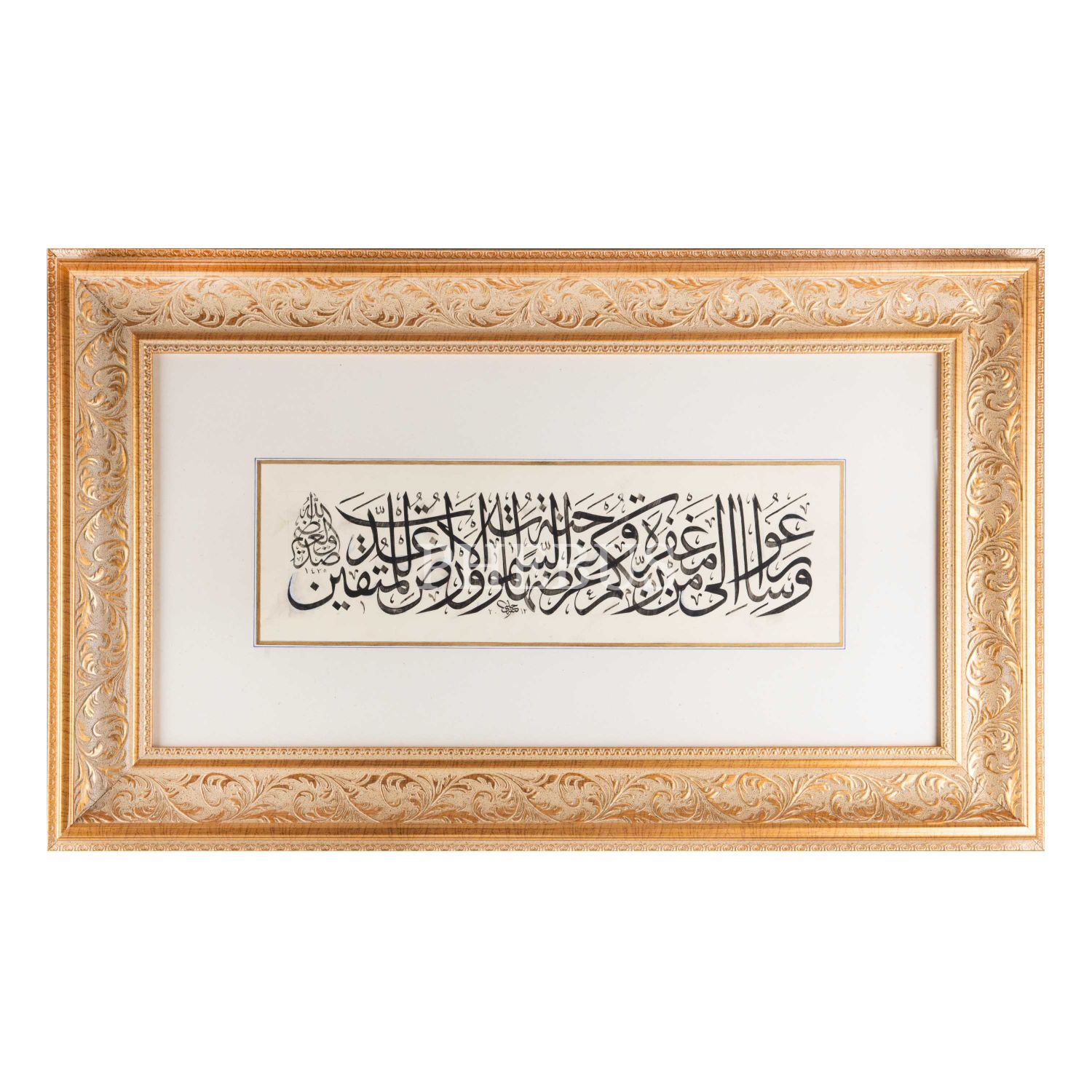 Hasan Çelebi ketebeli celî sülüs ayet-i kerime, 1435 tarihli, yazı ölçü: 54x17 cm, çerçeve ölçü: 92x55 cm...