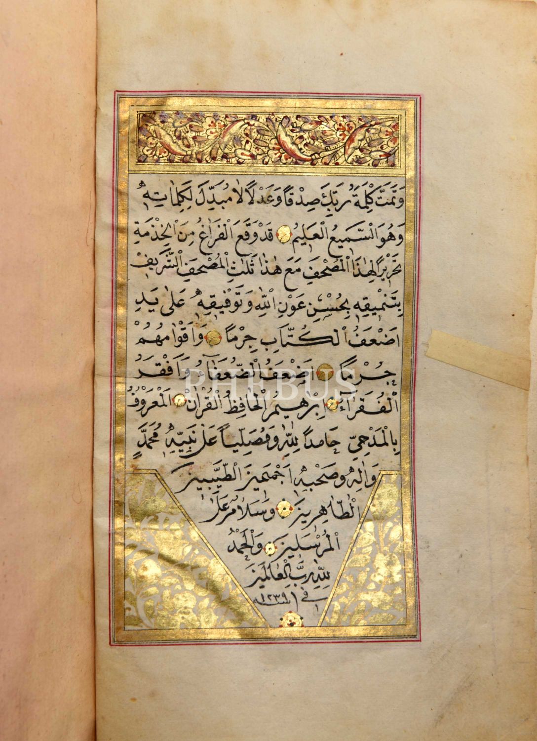 Eser; serlevhalı, tüm sayfaları tahrirli altın cetvelli ve altın duraklı, hizb ve cüz işaretleri altın tezyinatlı, sure başları altın levhalı, sayfa uçları tezhiplidir. Eserin baş tarafında serlevha öncesinde sure fihrişti bulunmaktadır. Eserin sonunda Felak ve Nas sureleri tüm sayfa tezhipli levhalar içinde yazılıdır. Deri dönem cildi içerisindedir.
