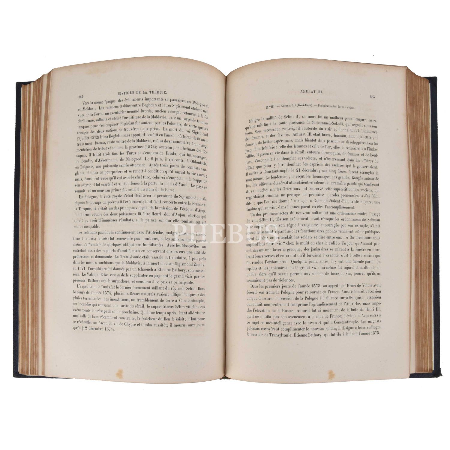 Kırım Harbi sebebiyle gözlerini Doğu´ya çeviren Avrupa kamuoyuna, pek çok farklı unsurdan meydana gelen Osmanlı İmparatorluğu´nu kurumları, adetleri, ırkları, halkları ve dinleriyle tanıtmak maksadıyla, Fransız tarihçi Theophile Lavallee (1804-1866) tarafından kaleme alınmış bir Osmanlı tarihi kitabı... Kitapta Thomas Allom´un 18 adet çelik baskı gravürü yer almaktadır. Sırtı panelli, altın yaldız dekor ve başlıklı dönem cildinde. Sayfa kenarları altın yaldızlıdır.