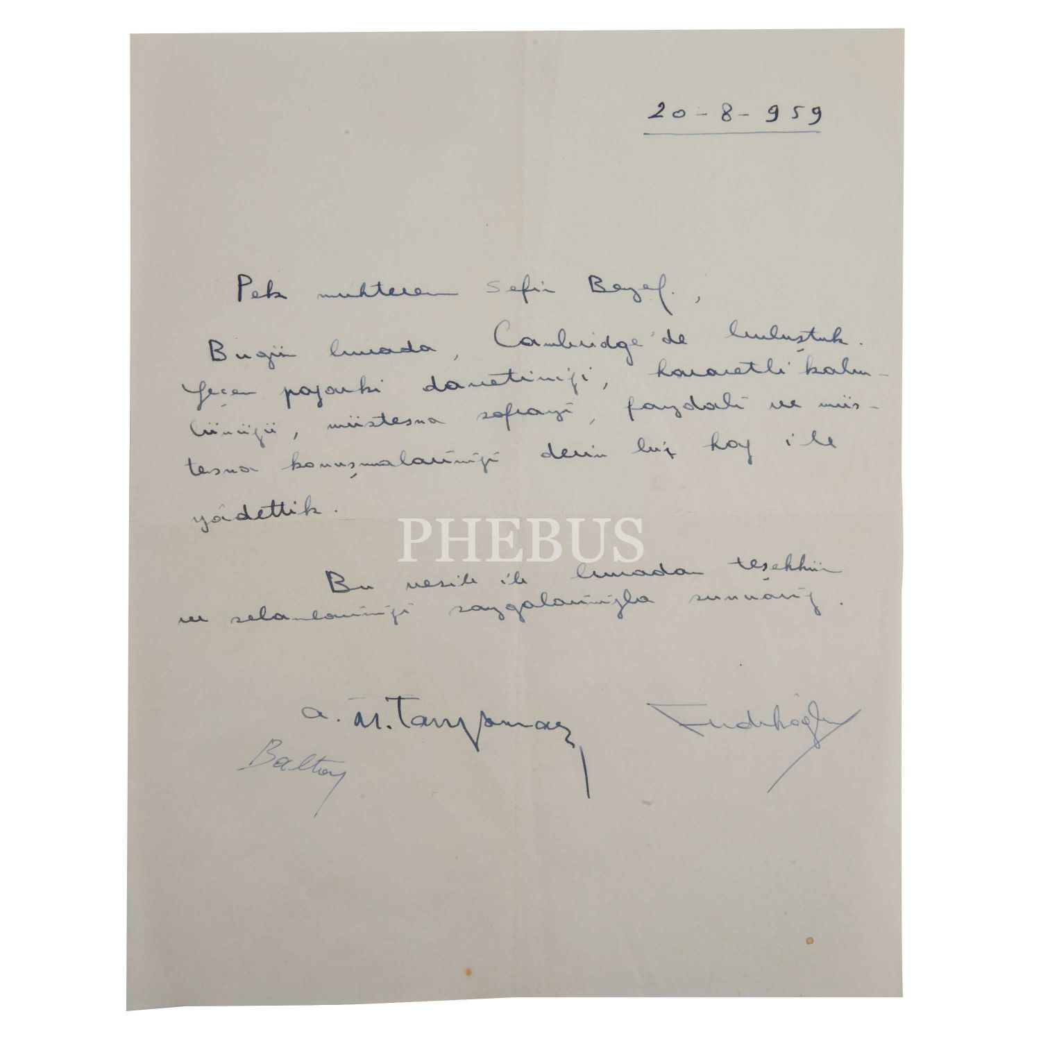 Ahmet Hamdi Tanpınar´ın, 1959 yılında gittiği Cambridge´de, Londra Sefiri Muharrem Nuri Birgi´ye hitaben yazdığı ve kendisi ile dostları adına teşekkürlerini sunduğu mektubu... Mektup, Tanpınar´ın yanı sıra Ord. Prof. Dr. Ziyaeddin Fahri Fındıkoğlu´nun ve hukukçu ve siyasetçi Tahsin Bekir Balta tarafından da imzalanmıştır. 20x25 cm...