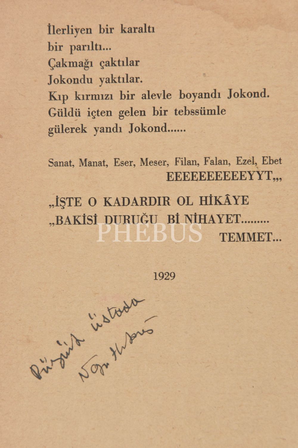 Nazım Hikmet´in Latin harfleriyle yayımlanan ikinci kitabı olan bu eserini, yaşadığı devirde "üstat" olarak kabul edilen kişilere itibar etmemesine karşın; eserlerinde hurafelere, yobazlara, sonradan görmelere, paşazadelere ve mütegallibeye karşı bir tutum alan ve halk için sade bir dille yazan Hüseyin Rahmi´ye "Büyük Üstat" olarak imzalaması manidardır. İthaf ve imzasını, "Sanat, Manat, Eser, Meser, Filan, Falan..." dizeleriyle biten eserinin son sayfasına koyan şair, muhtemelen, çağdaşlarının aksine, süslü ve sanatlı söyleyişten pek hazzetmeyen Hüseyin Rahmi´ye bir gönderme yapmak istemiş olmalıdır. Müzayedemizde sunduğumuz eser, Hüseyin Rahmi Gürpınar´ın yakın akrabalarının kütüphanesinden çıkmıştır.