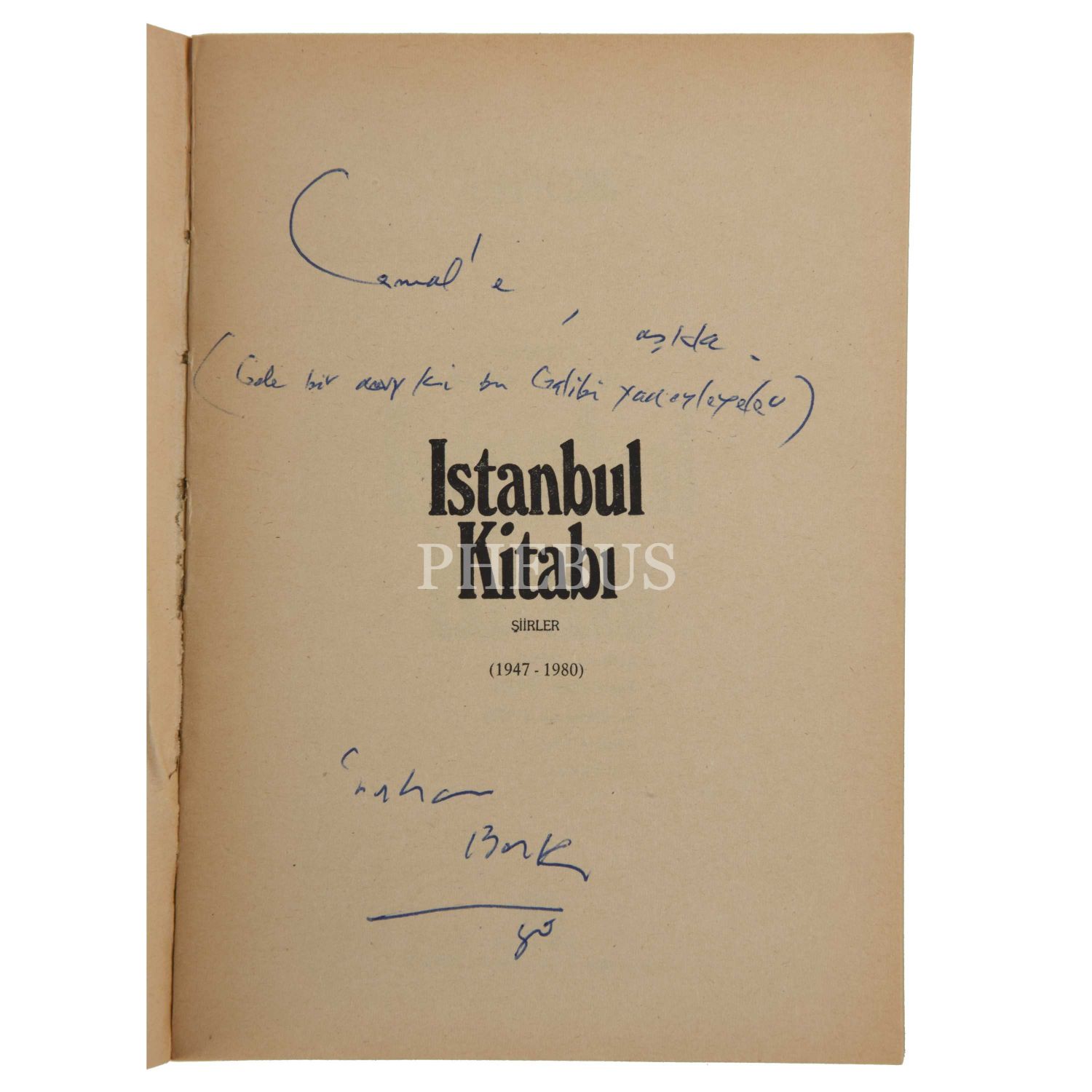 İkinci Yeni´nin, durmadan yatak değiştirerek kendini yenileyen, en deneysel ve üretken şairi İlhan Berk´ten; İkinci Yeni´nin neredeyse tüm yükünü sırtlanan ve en önde gelen şairi Cemal Süreyaya "Cemal´e, aşkla" ithafı ve Şeyh Galib alıntısıyla, 1980 yılında imzalı: "Gele bir devr ki bu Gâlibi yâd eyleyeler."