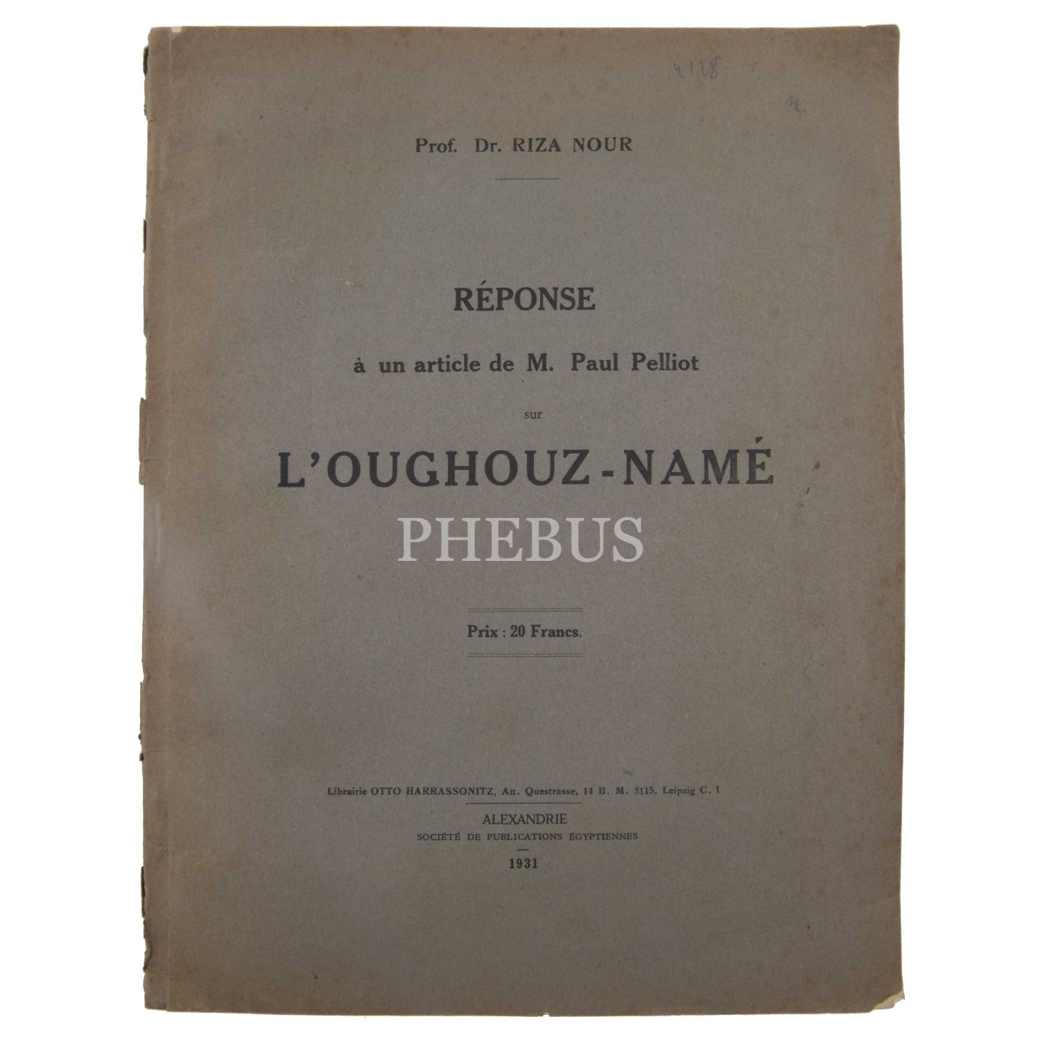 REPONSE A UN ARTİCLE DE M. PAUL PELLIOT SUR L´OUGHOUZ-NAME, Rıza Nur, 1931, Librairie Otto Harrassonitz (Mısır, İskenderiye), 41 sayfa, 21x28 cm...