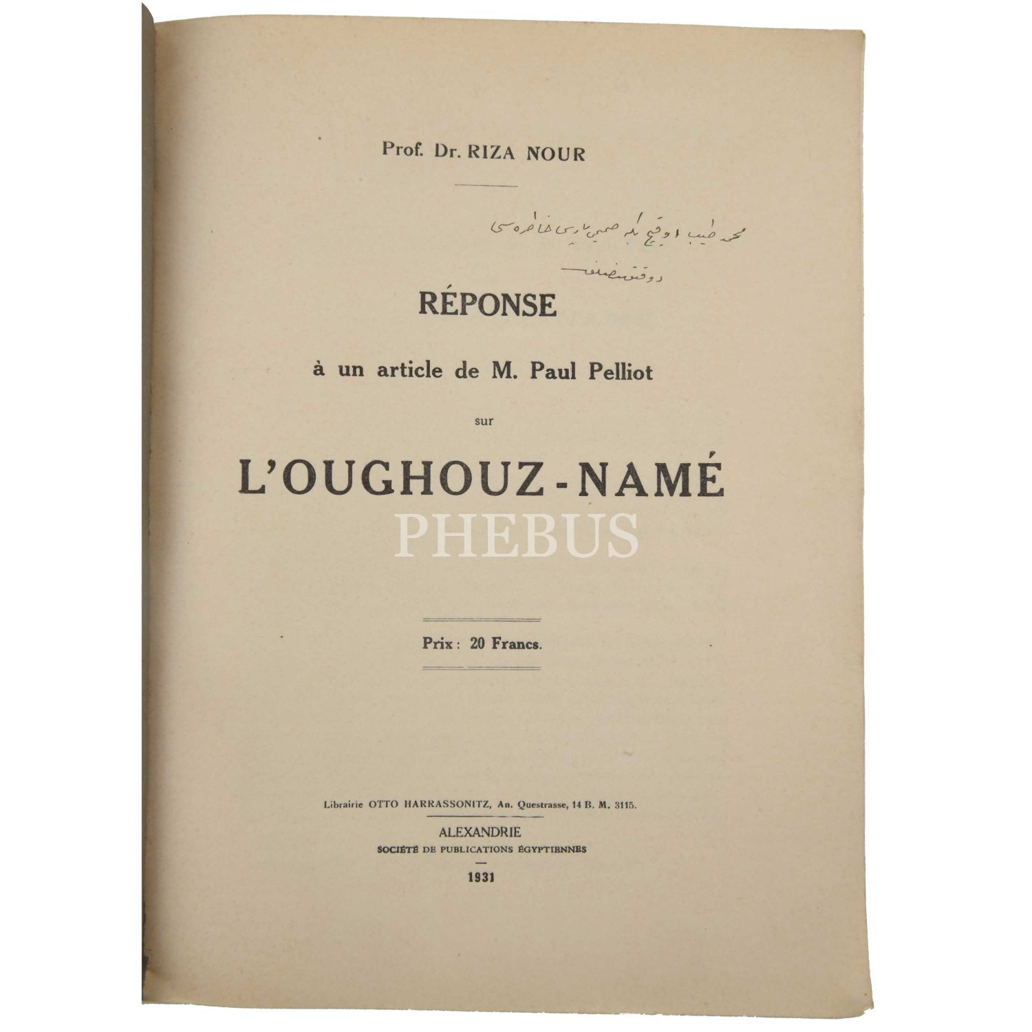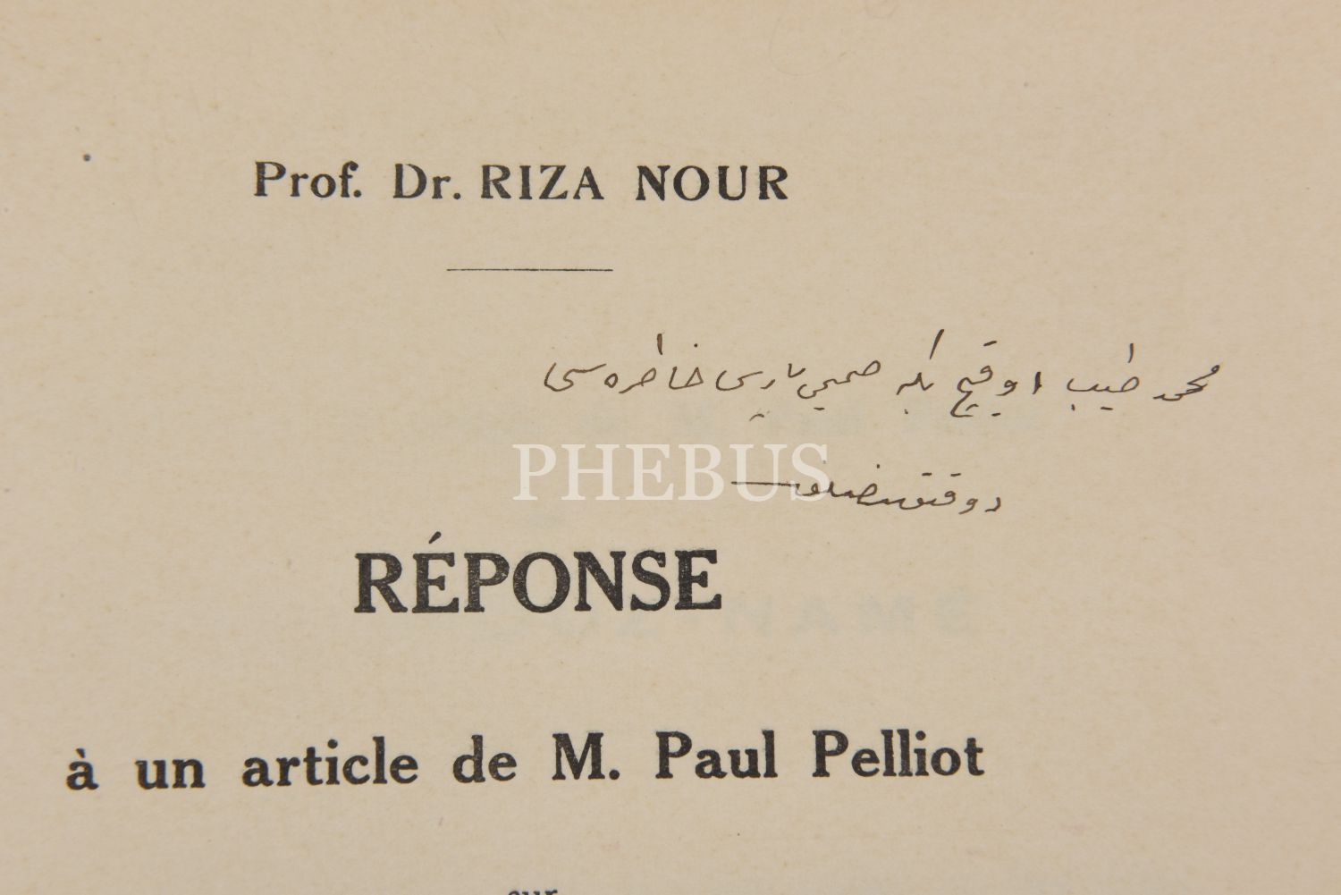 Dr. Rıza Nur´un 1928 yılında yayımladığı "Oğuz Kağan Destanı" adlı incelemesi hakkında “Sur la legende d’Uguz-Khan en écriture ouigoure" başlıklı bir inceleme ve eleştiri yayımlayan Paul Pelliot'nun bu yazısına karşılık, yine Rıza nur tarafından cevap niteliğinde yazılan kitapçık... Müzayedeye sunduğumuz nüsha, Dr. Rıza Nur tarafından "Mehmed Tayyip Okiç Bey´e samimi Paris hatırası" ithafıyla imzalanmıştır.