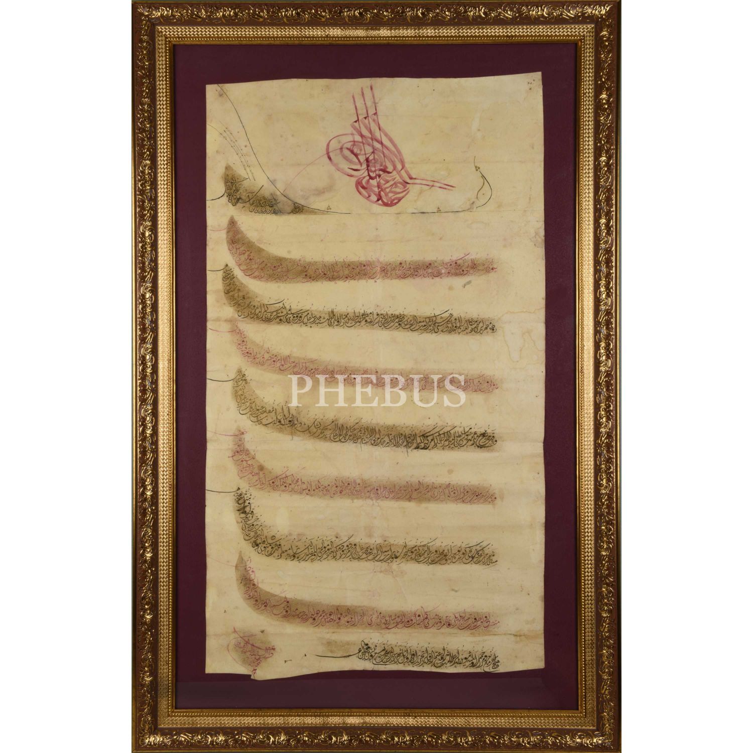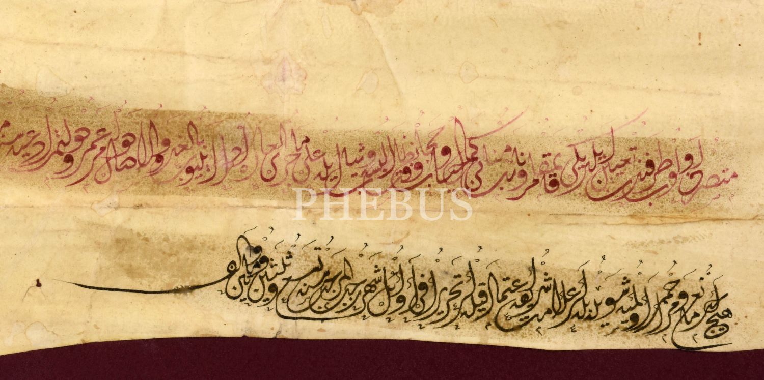 Medine-i Münevvere'de Ravza-ı Mutahhara hizmetinde bulunan Üsküp Mutasarrıfı Malik Paşa'nın vefatı nedeniyle ferraşlık görevinin biraderzadesi Ali Seyyid Mehmed Yaşar Paşa'ya tevdi edildiğine dair el çekme Sultan II. Mahmut tuğralı berat, berat 54x96 cm, çerçeve 119x77 cm...