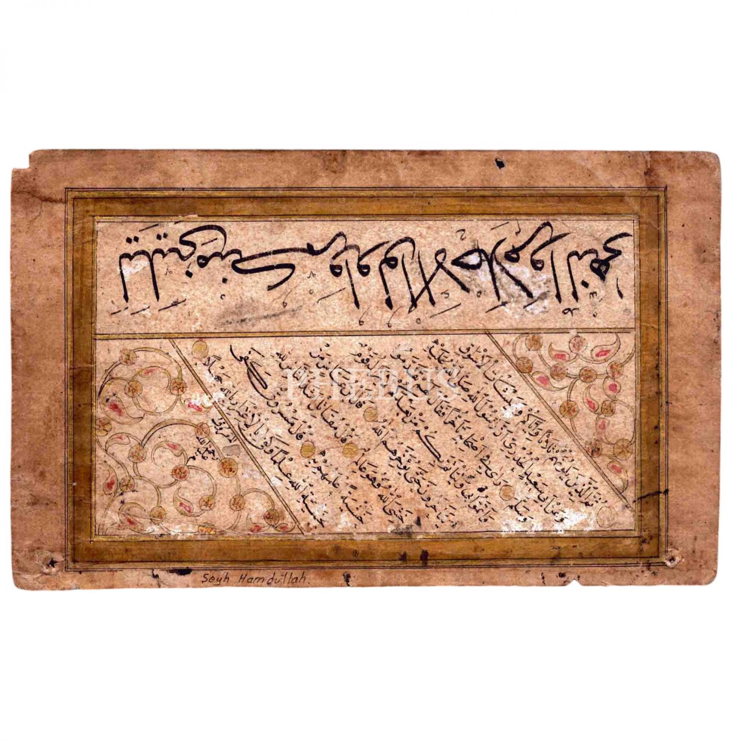 Alt tarafında “Şeyh Hamdullah” notu mevcut hoca işi eski dönem sülüs-nesih kıta, 21x13 cm...