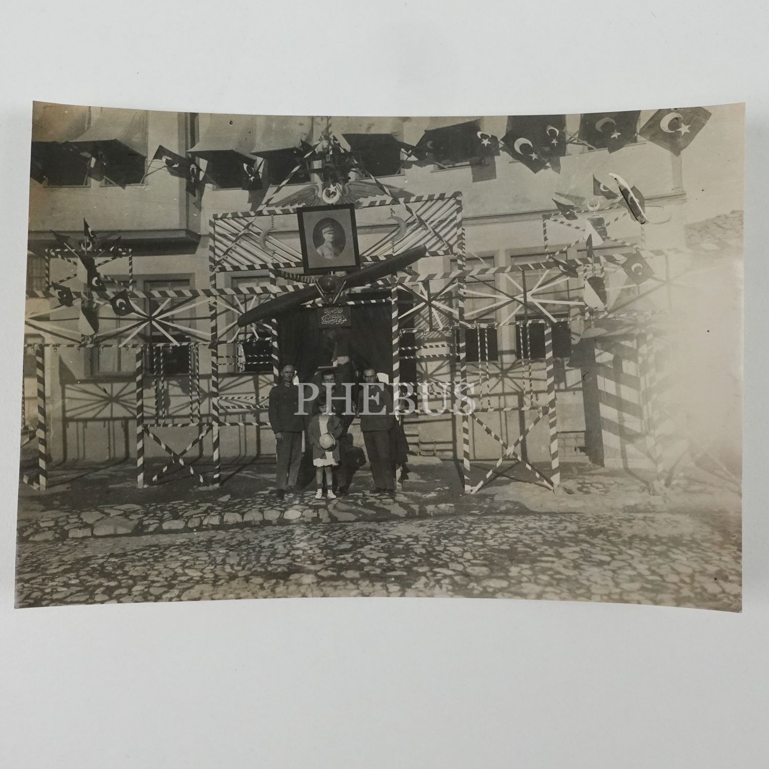 Girişine Mustafa Kemal Atatürk portresi yerleştirilmiş ve bayraklarla donatılmış "Türkiye Cumhuriyeti Hava Kuvvetleri Müfettişliği" binası önünde hatıra fotoğrafı çektiren üç subay ve bir küçük kız, 17x12 cm...