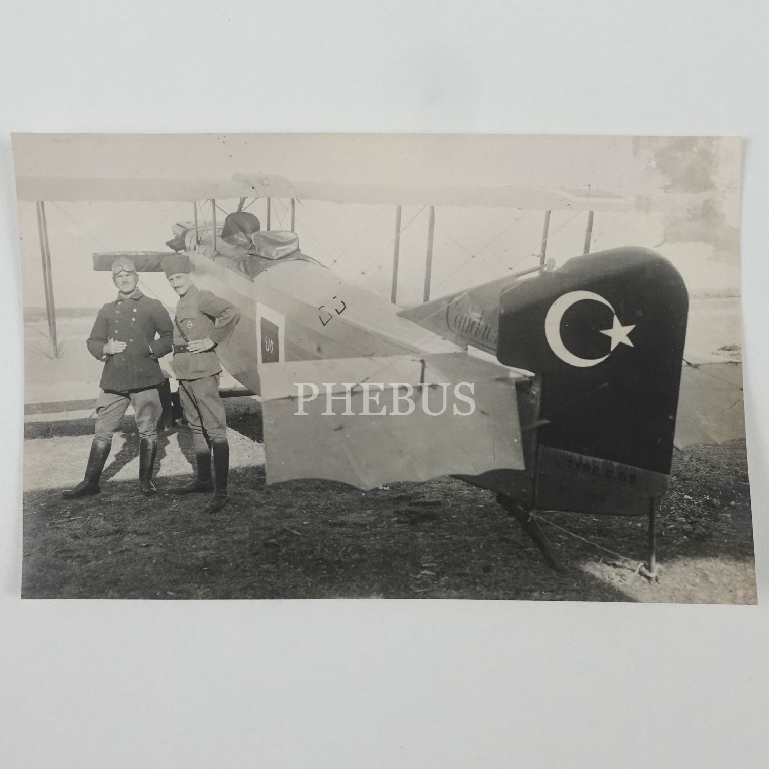 "482" numaralı Caudron C.59 model Türk uçağı önünde iki Türk subayı, 16,5x10 cm...
