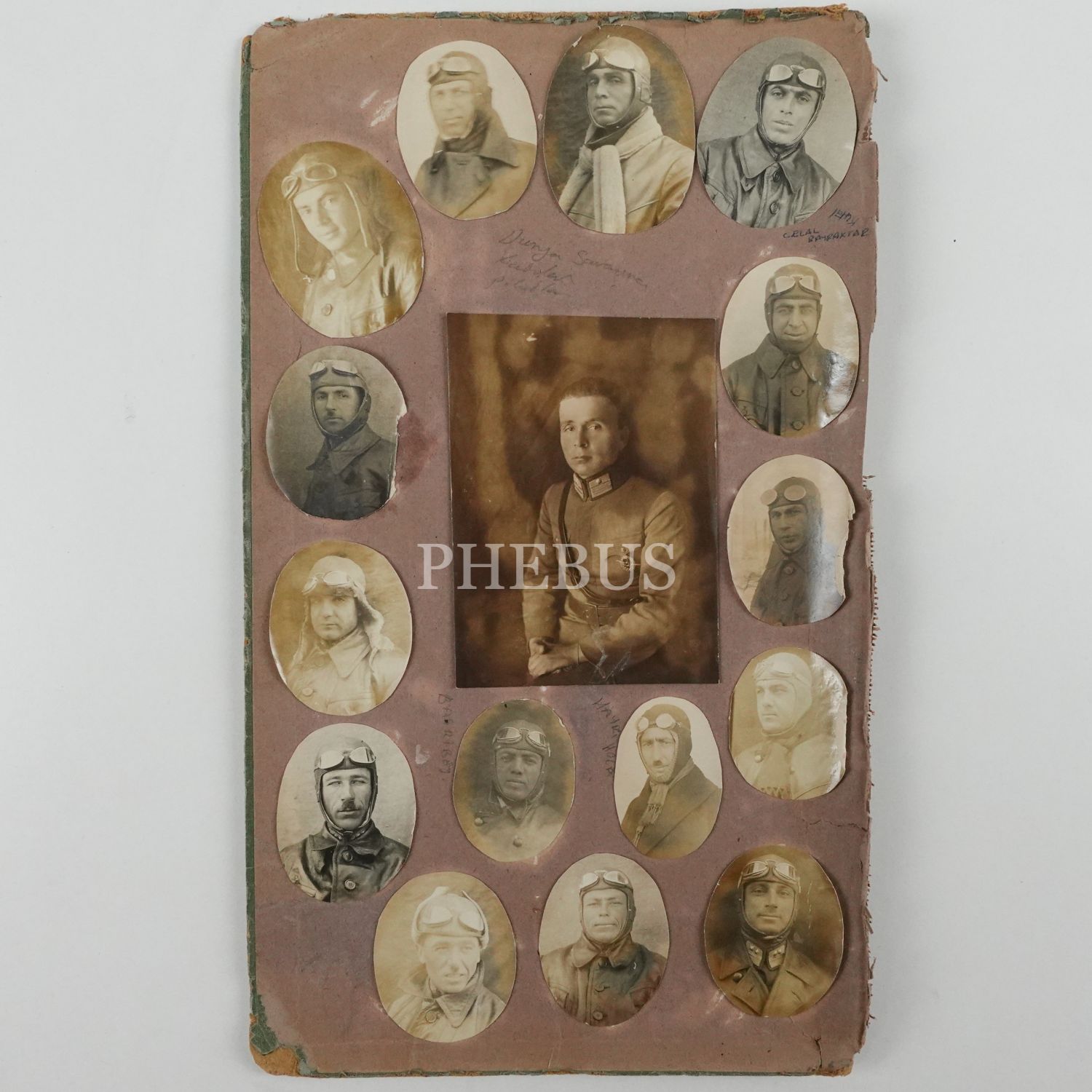 "Dünya Savaşına Katılan Pilotlar" başlığıyla bir araya toplanmış 16 Türk pilotu fotoğrafı, albüm kapağına yapışık, 22x37 cm...