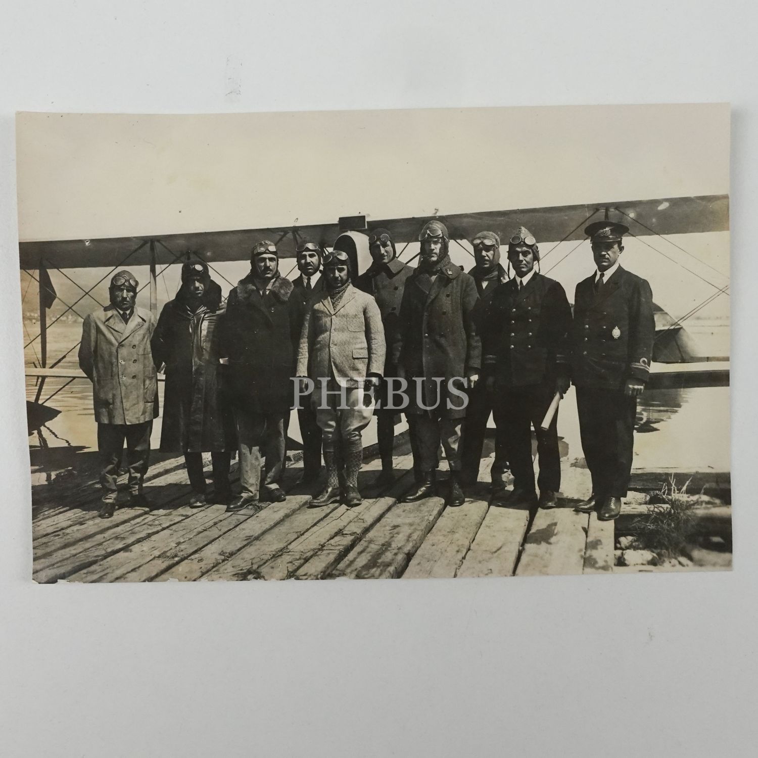Hava filomuza dahil edilen Savoia 59 model İtalyan deniz uçağı önünde Türk pilotları, 16,5x11 cm...